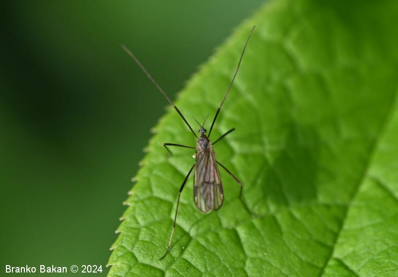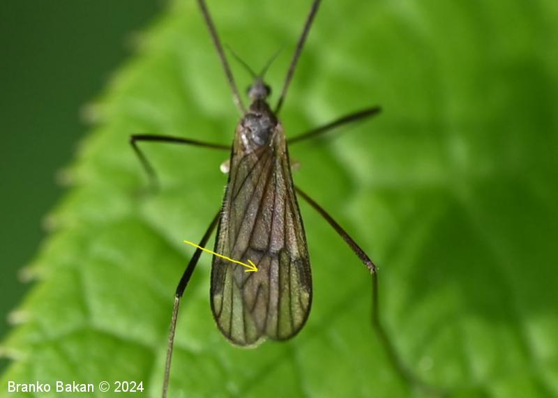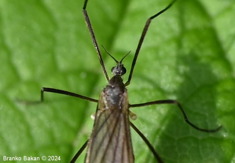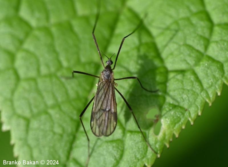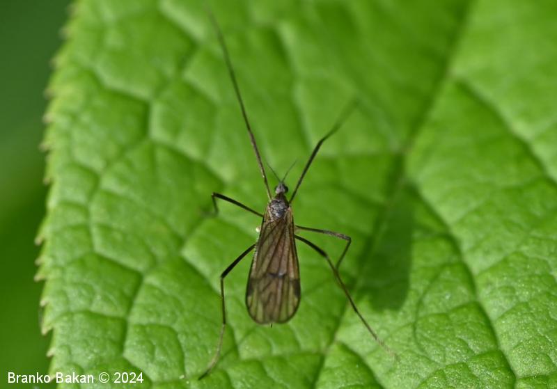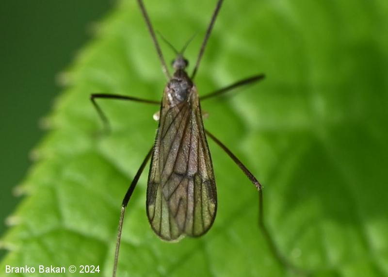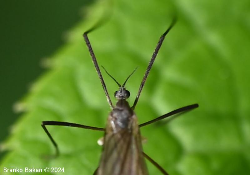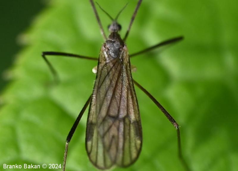Odrasli osebki: glava je dokaj drobna, sivkasta, tipalnice so drobnočlenaste, temne, pri samcih so gosto porasle z mehkimi, daljšimi ščetinami vzdolž členkov, pri samicah so ščetine kratke in omejene na rob členkov. Oprsje je sivkasto, z osrednjo temno črto v sprednjem delu. Krila so dokaj široka in kratka, rahlo rjavkasta, puhasto kratkodlakava (predvsem ob robovih), s temno pterostigmo, diskalna celica je odprta (nima prečne povezave), diskalni žili sta zatemnjeno oprašeni. Zadek je sivkast, vitek, pri samcih se konča z dvema izrastkoma (stilusa), ki sta del spolnega aparata, svetlejši je topo koničast in rahlo usločen, drugi, ki je črnokoničast, je močno kavljasto ukrivljen. Pri samicah se zadek podaljša v sternalne valve, ki so debele, na vrhu se naglo zožijo v konico. Noge so zelo dolge in tanke, temne.