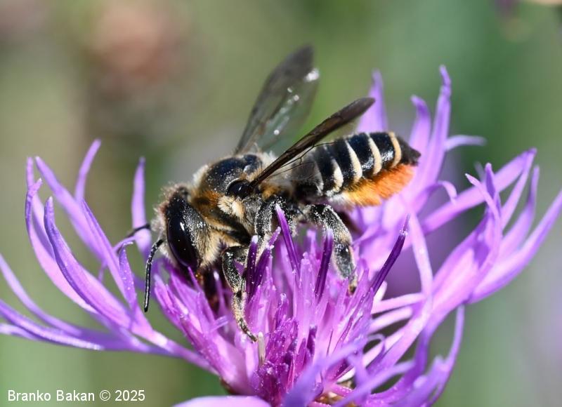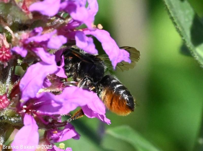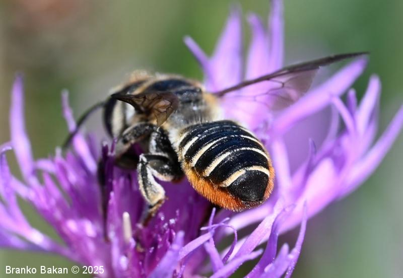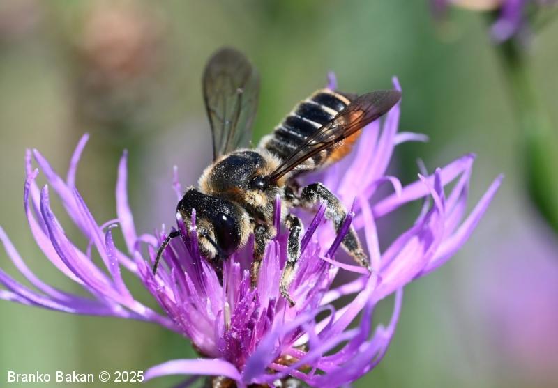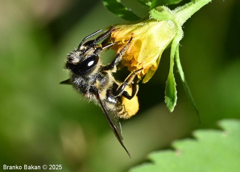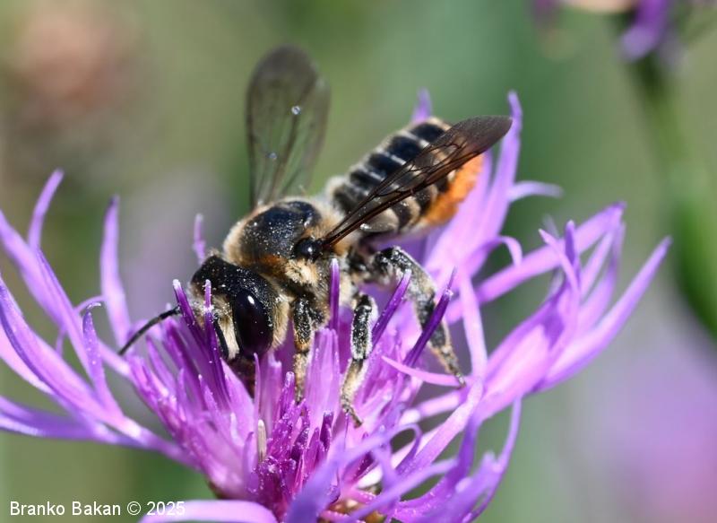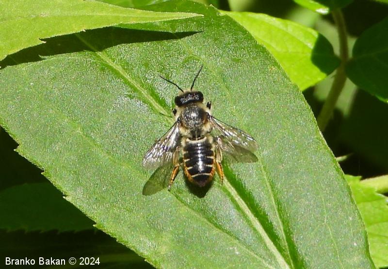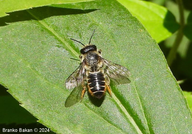 Samica: "čebeljelika" s črnorjavim telesom. Glava je široka, na sprednjem delu ploska, hrapava, na redko porasla z rjavkastimi dlakami. Čeljusti so nad sredino razširjene in imajo drobne zobce na notranji strani. Tipalnice so temne, drobnočlenaste, bazalni členek je mnogo daljši od ostalih. Oprsje je krepko, črno ali črnorjavo, nekoliko hrapavo, večji del golo, le ob straneh gosteje poraslo s svetlejšimi dlakami. Krila so prosojna, dobro ožiljena, kostalni del je nekoliko krepkejši. Zadek je po zgornji strani črn, pretežno gol, nekoliko bleščeč, sprednji segmenti so večinoma le ob straneh ozko svetlo obrobljeni, pri zadnjih segmentih so ti pasovi sklenjeni, trebušni del zadka je gosto porasel z oranžnimi ali rumenorjavimi dlakami (trebušna krtača). Noge so temne, porasle s svetlimi dlakami, le zadnje goleni so porasle z oranžnimi do rjavkastimi dlakami.
