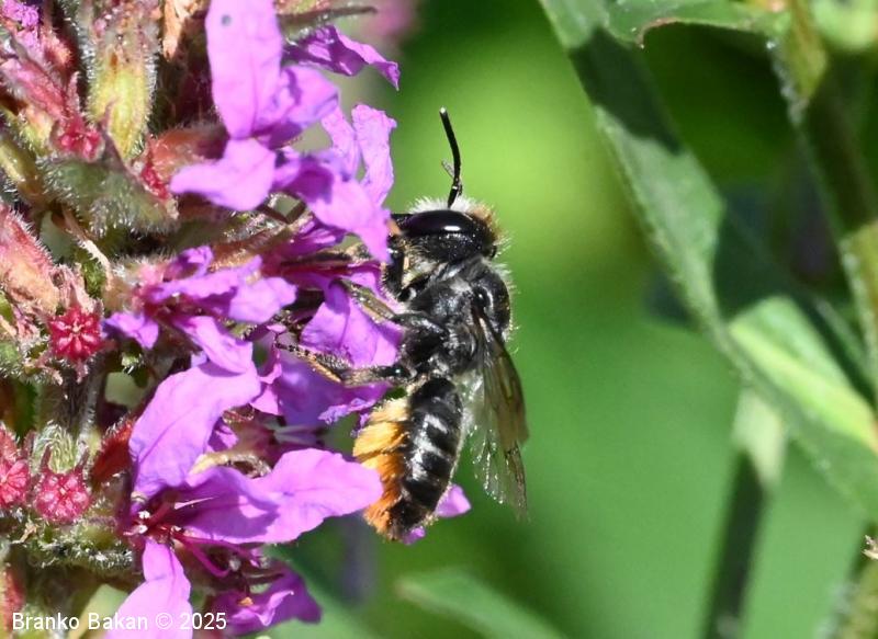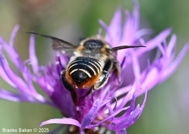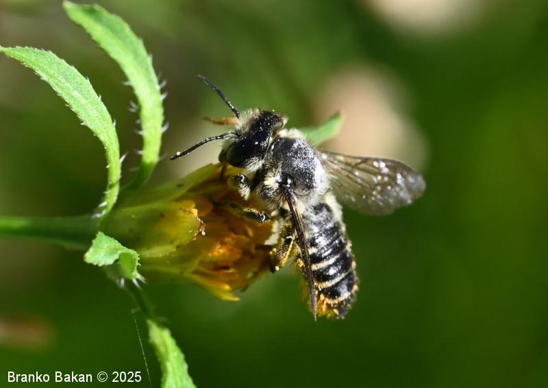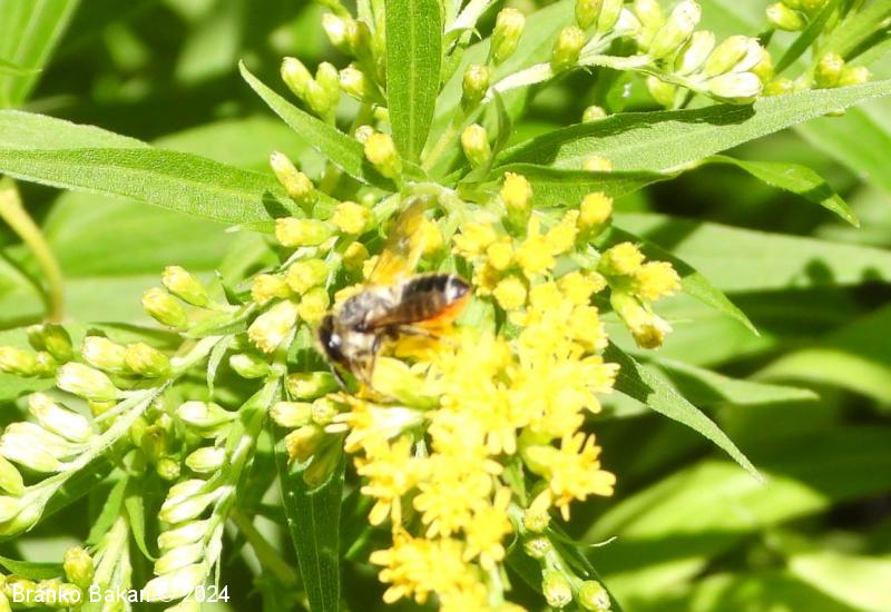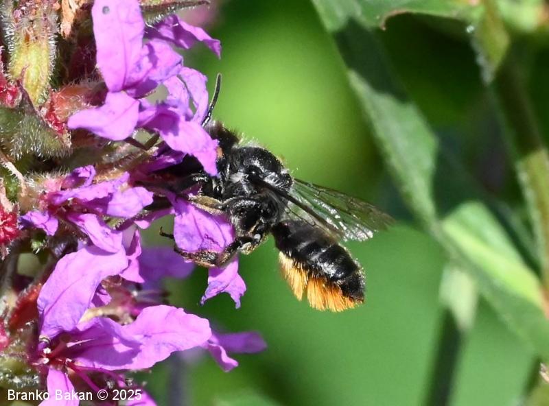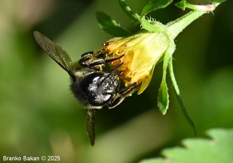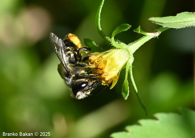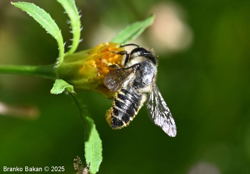 Samica: "čebeljelika" s črnorjavim telesom. Glava je široka, na sprednjem delu ploska, hrapava, na redko porasla z rjavkastimi dlakami. Čeljusti so nad sredino razširjene in imajo drobne zobce na notranji strani. Tipalnice so temne, drobnočlenaste, bazalni členek je mnogo daljši od ostalih. Oprsje je krepko, črno ali črnorjavo, nekoliko hrapavo, večji del golo, le ob straneh gosteje poraslo s svetlejšimi dlakami. Krila so prosojna, dobro ožiljena, kostalni del je nekoliko krepkejši. Zadek je po zgornji strani črn, pretežno gol, nekoliko bleščeč, sprednji segmenti so večinoma le ob straneh ozko svetlo obrobljeni, pri zadnjih segmentih so ti pasovi sklenjeni, trebušni del zadka je gosto porasel z oranžnimi ali rumenorjavimi dlakami (trebušna krtača). Noge so temne, porasle s svetlimi dlakami, le zadnje goleni so porasle z oranžnimi do rjavkastimi dlakami.