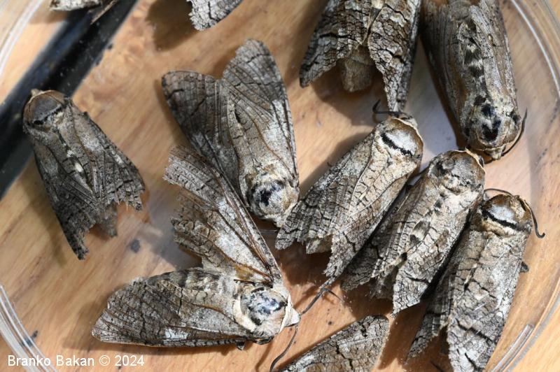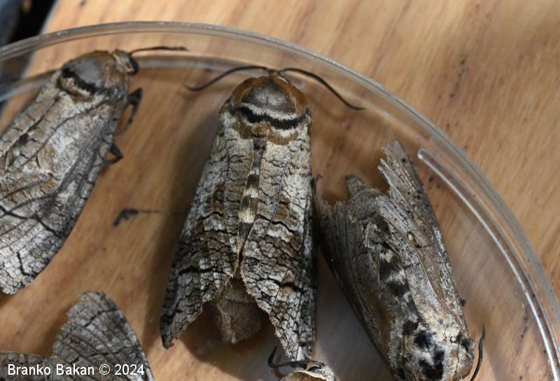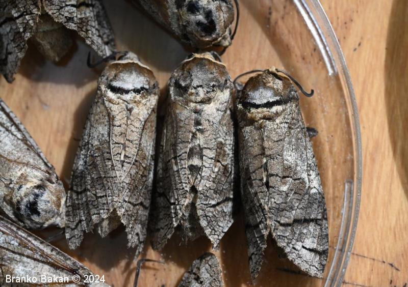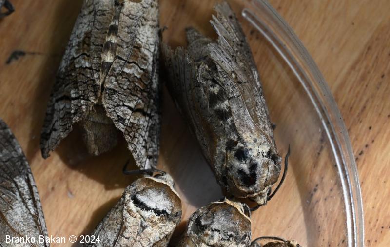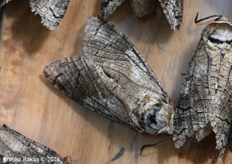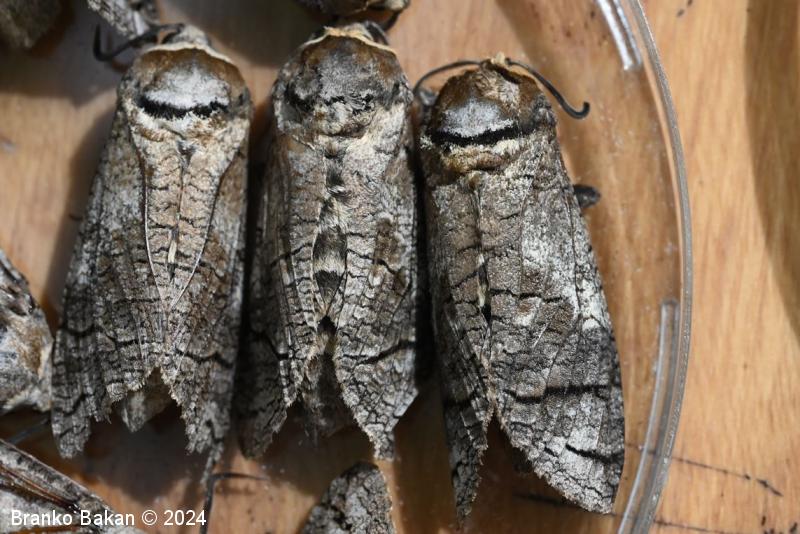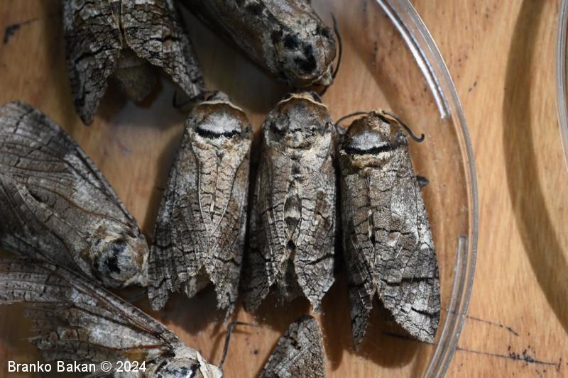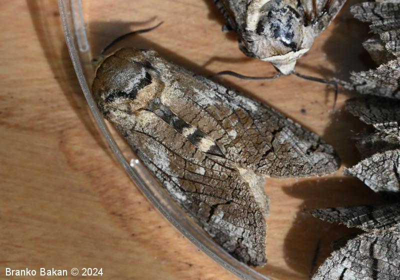 Odrasli osebki: zelo veliki "nočni metulji" s sivimi ali sivorjavimi sprednjimi krili, ki so fino drobno prečno črtkano marmorirana in tvorijo vzorec, ki spominja na skorjo dreves ali na posušen list. V sprednjem ali zadnjem delu so pogosto belkasto ali sivkasto poprhnjena, v postdiskalnem delu mnogokrat z ozko prečno črto. Zadnja krila so prav tako sivorjava, s podobnim, vendar manj izrazitim vzorcem kot na sprednjih krilih. Glava je drobna, porasla s svetlimi dlakami, tipalnice so temne, zelo drobno glavničaste. Oprsje je krepko, sivorjavo, v sprednjem delu svetlo obrobljeno in z značilno črno prečno črto v zadnjem delu, ki je svetlo obrobljena. Zadek je precej velik, sivorjav s svetlejšimi dlakami.