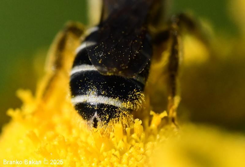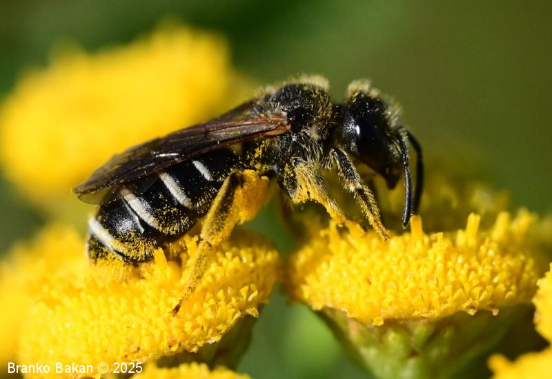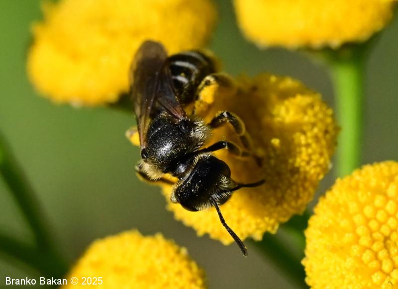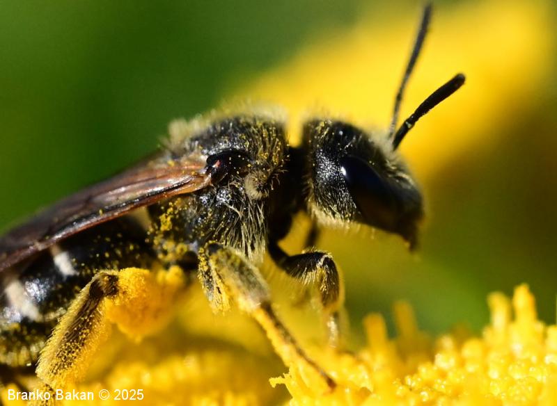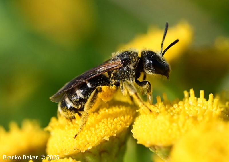 Samica: je vitka, črno obarvana, rahlo bleščeča. Glava je precej široka, skoraj kvadratasta, z zgornje strani rahlo jamičasto sploščena, gosto fino jamičasta. Tipalnice so črne, dokaj kratke. Oprsje je večinoma golo, fino drobno jamičasto, ob straneh poraslo s svetlejšimi dlakami. Krila so prosojna, pterostigma je rumenkastorjava, ozka. Zadek je vretenast, črn, segmenti so na spodnjem (apikalnem) delu (!) v pasovih obrobljeni z belimi dlakami, ki so v sredini pogosto prekinjeni, segmenti so včasih v osrednjem delu rdečkasto nadahnjeni, konica zadka ima za rod značilno ozko brazdo. Noge so črne, zadnje so nekoliko bolj ploske, srednje in zadnje goleni ter stopalca so porasla z rumenkastimi dlakami.