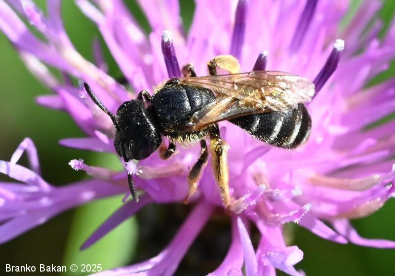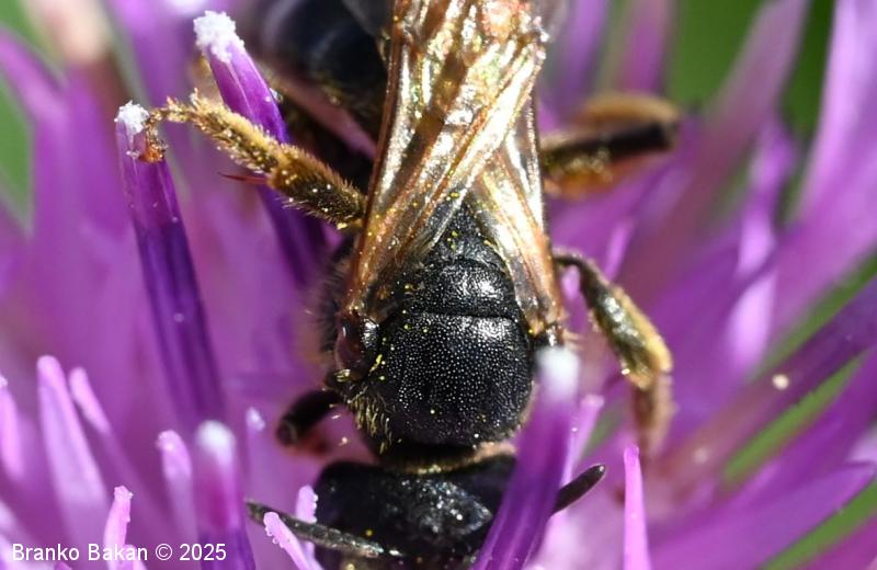 Samica: je vitka, črno obarvana, rahlo bleščeča. Glava je precej široka, skoraj kvadratasta, z zgornje strani rahlo jamičasto sploščena, gosto fino jamičasta. Tipalnice so črne, dokaj kratke. Oprsje je večinoma golo, fino drobno jamičasto, ob straneh poraslo s svetlejšimi dlakami. Krila so prosojna, pterostigma je rumenkastorjava, ozka. Zadek je vretenast, črn, segmenti so na spodnjem (apikalnem) delu (!) v pasovih obrobljeni z belimi dlakami, ki so v sredini pogosto prekinjeni, segmenti so včasih v osrednjem delu rdečkasto nadahnjeni, konica zadka ima za rod značilno ozko brazdo. Noge so črne, zadnje so nekoliko bolj ploske, srednje in zadnje goleni ter stopalca so porasla z rumenkastimi dlakami.