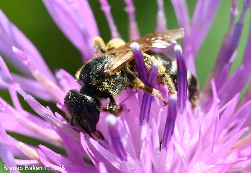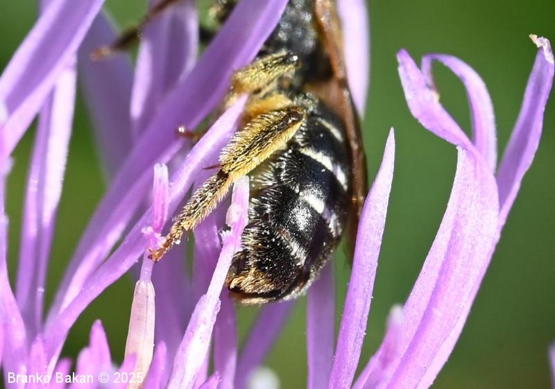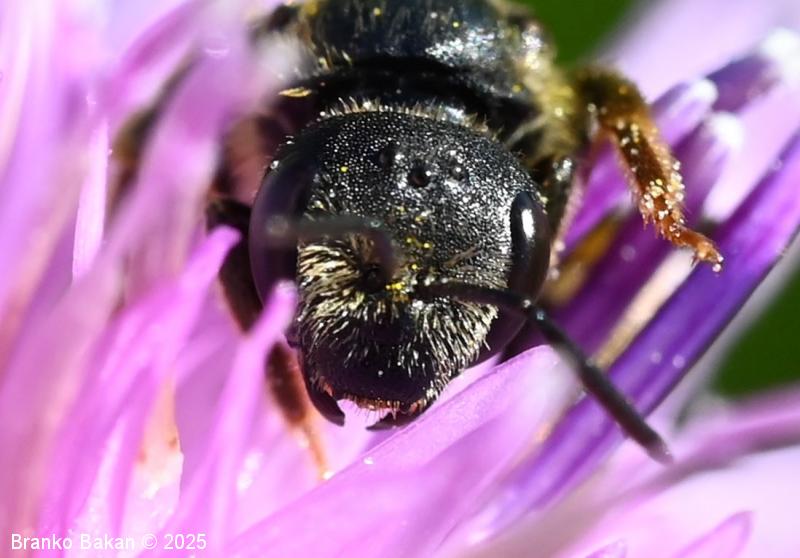 Samec: podoben je samici, le da ima nekoliko manjšo in bolj zaokroženo glavo, frontalni del glave je porasel z belimi dlakami, nadustna ploščica (klipeus) je svetla. Tipalnice so nekoliko širše in precej daljše kot pri samici. Stegenca nog so črna, goleni in stopalca so rumenkasta, skoraj gola.