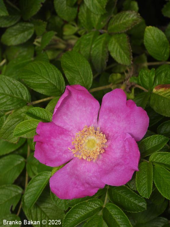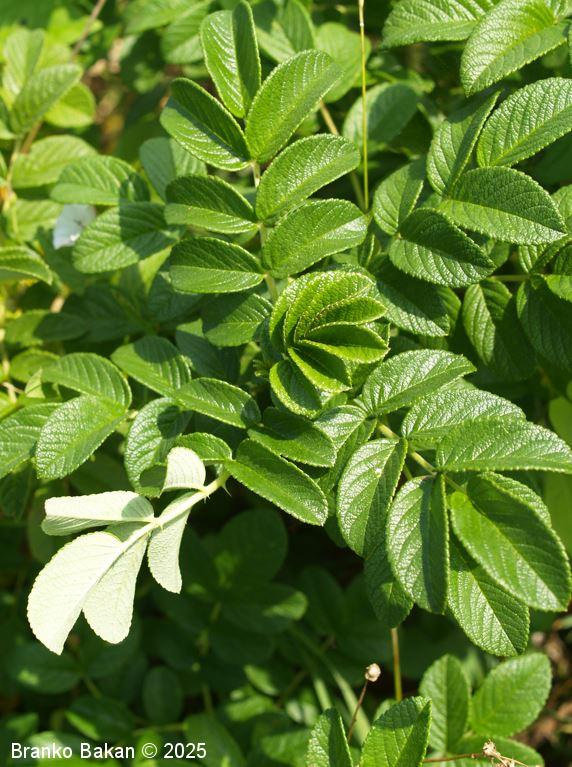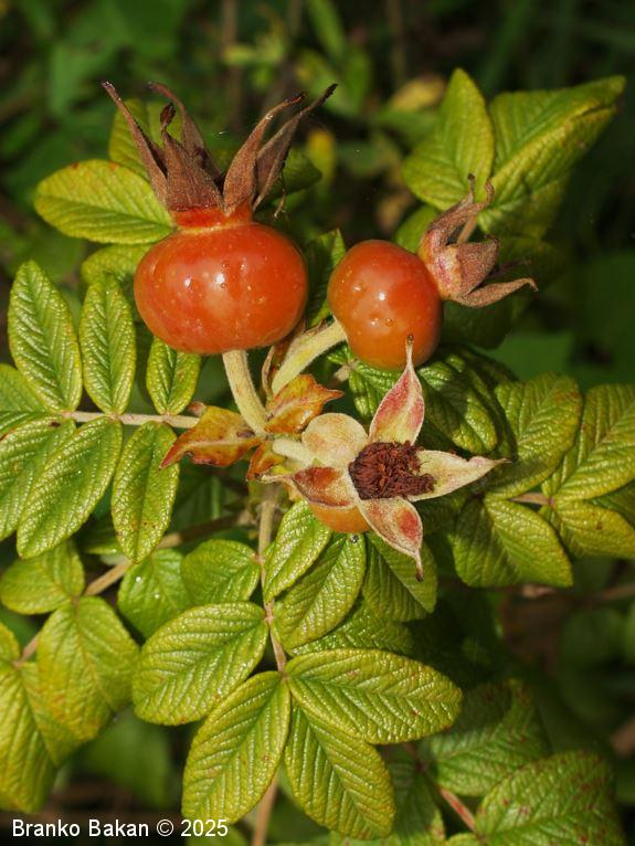 Opis: nizek, močno razrasel grm s podzemnimi pritlikami. Poganjki so gosto porasli s togimi, ravnimi igličastimi bodicami. Listi so lihopernato sestavljeni iz 5 do 9 lističev, ki so 8 do 15 cm dolgi, eliptični, z zaokroženim dnom, po robu plitvo drobno in topo nazobčani, s hrapavo površino in izrazito ožiljeni, po zgornji strani temnozeleni, goli, po spodnji strani belkasti in dlakavi po žilah. Cvetovi so veliki 6 do 8 cm, škrlatni ali temnorožnati (včasih tudi beli - f. alba), močno dehteči. Čašni listi so celi, po odcvetu navzgor štrleči in ostanejo na plodu. Plod (birni orešek) je 2 do 3 cm velik, spominja na jabolko, ob zrelosti rdeč ali oranžnordeč.