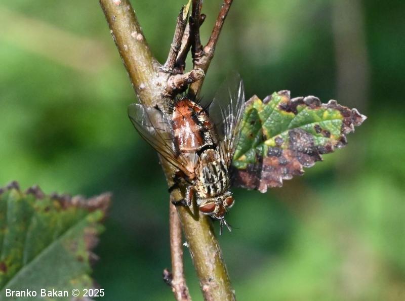 Odrasli osebki: telo je precej kompaktno, prepoznavno po oranžnorjavem zadku. Glava je svetla z oranžnorjavim temenskim predelom, frontalni del je gladek in neporasel, ščetine se nahajajo le v spodnjem delu glave. Oči so precej velike, rjavordeče, gosto dlakave, obočesni del je svetel, porasel s serijo črnih, daljših ščetin, tudi zatilni del je gosto porasel s svetlimi dlakami, zaočesne ščetine so črne. Tipalnice so pri vrhu betičaste, temnosive, bazalni členek je porasel s črnimi dlakami, ariste so črne in nitaste, dokaj dolge. Oprsje je krepko, gosto poraslo s ščetinami, sivkasto z belkastim poprhom, s štirimi vzdolžnimi, črnimi progami, ki so na suturalnem delu lahko prekinjene. Ščitek (scutellum) je krepak, polkrožen, umazano rumenorjav, z daljšimi marginalnimi in subapikalnima ščetinama. Krila so prosojna, dobro ožiljena, stična razdalja prečni žil na osrednji žili je zelo kratka, zato sta lahko ti navidezno povezani. Zadek je precej velik, jajčasto trikoten, lisičje- ali oranžnorjav, ob straneh svetlo poprhnjen in s temno osrednjo črto, na 4. do 6. segmentu porasel s togimi, štrlečimi črnimi ščetinami. Stopalca nog so črna, stegenca in goleni so oranžne ali rjavkaste.