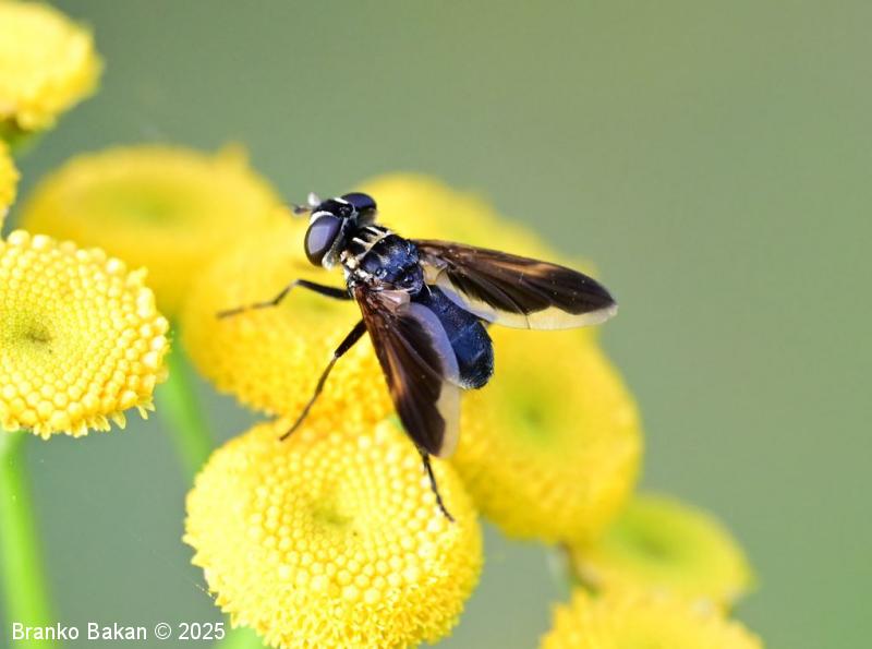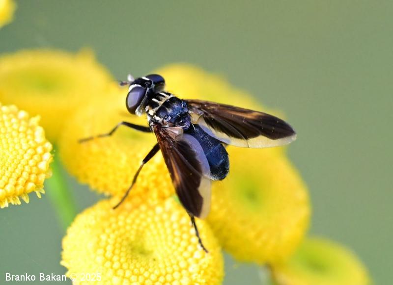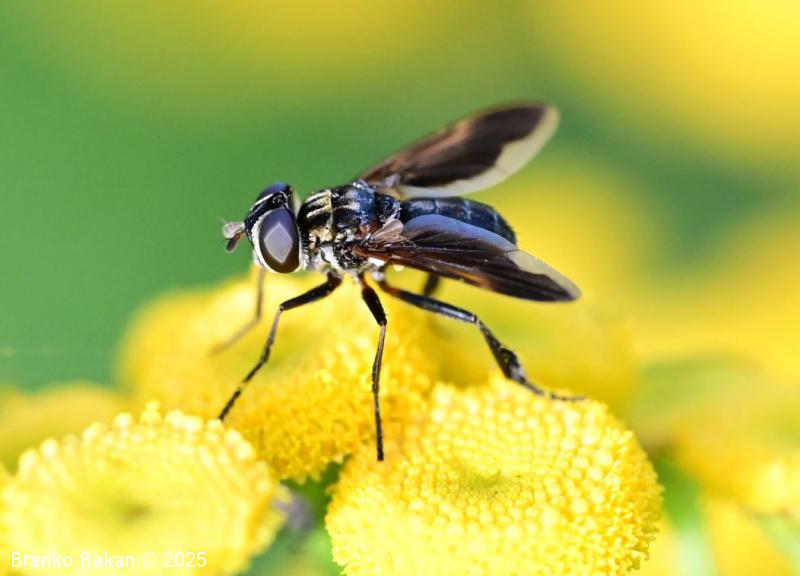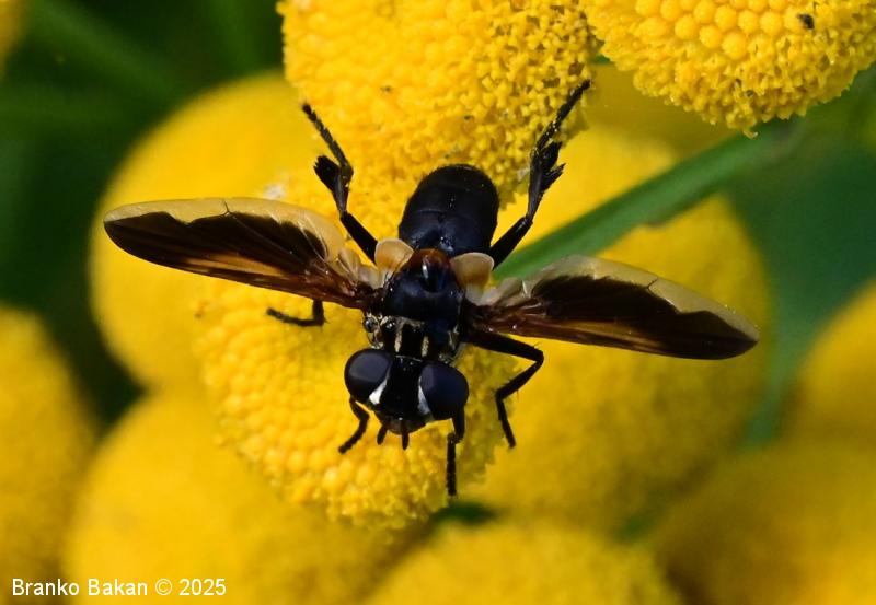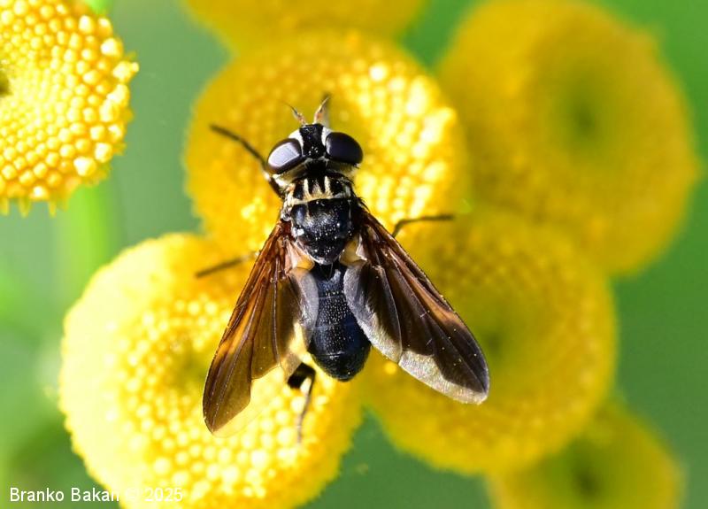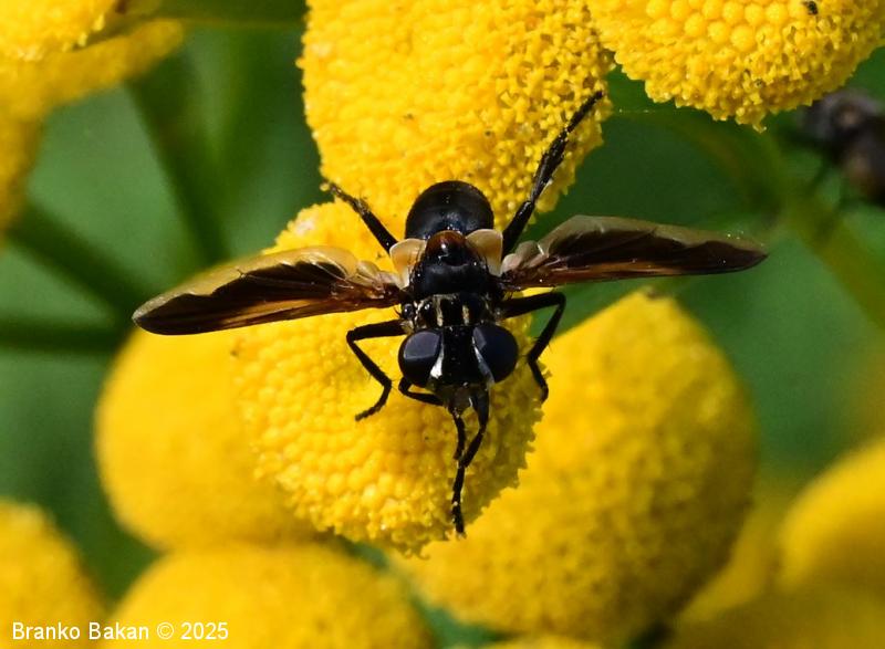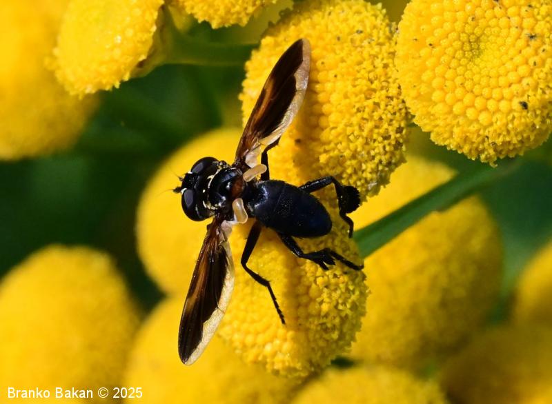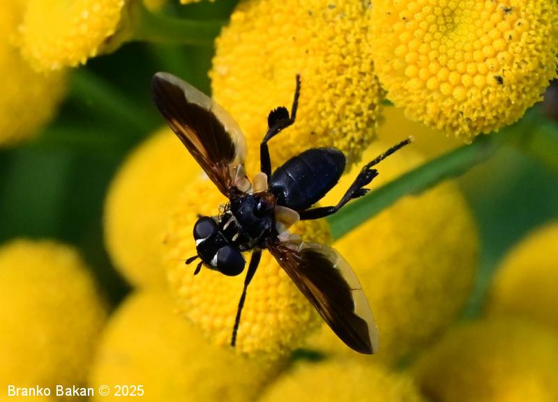 Odrasli osebki: lahko so različno obarvani, črni, oranžni ali črnorjavi, prepoznavni po "pisanih" krilih. Glava je po temenu večinoma rumenkasta, z osrednjo črno črto, frontalni del je bolj belkast z ozkima obstranskima črtama, ki potekata od tipalnic do ustnega dela. Tipalnice so betičaste, črne ali nekoliko bolj oranžne, z nitastimi aristami. Oprsje je v sprednjem delu rumenkasto ali oranžno, vzdolžno črno progasto, v zašivnem delu je bolj temno, skoraj črno, pogosto z naprašenim rumenim črtastim vzorcem ali svetlo liso. Ščitek (scutellum) je dokaj velik, večinoma temen ali delno rumenkast, kratkodlakav, z dolgima subapikalnima ščetinama. Krila so "pisana", zunanji rob je prosojen, osrednji del je močno zatemnjen, skoraj črn, bazalni del je rumenkast ali rjavkast (obarvanost močno variira). Zadek je jajčast do okroglast, lahko je v celoti črn (najpogosteje pri smaicah) ali oranžnorumen do rjavkast (pogosto pri samcih). Noge so večinoma črne ali pa so stegenca in kolenca nekoliko rdečerjavkasta, pulvili (par listastih izrastkov na zadnjem členku stopalc) so zelo svetli, zadnje goleni so pri obeh spolih z zadnje strani gosto porasle s "peresastimi" ščetinami, kar jim daje poseben "hlačast" videz.