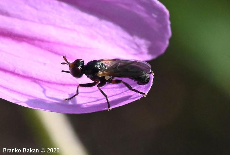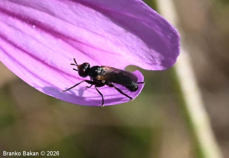 Samica: črna, z navzdol usločenim zadkom in "trnatim" izrastkom na spodnjem delu zadka (po tem predgenitalnem znaku ločimo samice od samca). Glava je skoraj okrogla, črna, lica so bela, temenski del pri tipalnicah je oranžnorumen. Rilček (proboscis) je raven, dokaj dolg in naprej štrleč. Tipalnice so rahlo kijaste, rumenkaste s temnejšimi konicami, ariste so nitaste, črne, 2. členek je mnogo daljši od 3. členka. Oči so dokaj velike, obstranske, rdeče. Oprsje je dokaj krepko, bleščeče črno, ob straneh s sivkastim poprhom. Ščitek (scutellum) je polkrožen, črn. Krila so prosojna do rahlo temnikasta, na bazi rumenkasta, podolgasto ovalna, ne presegajo zadka. Zadek je črn in sivkasto poprhnjen, na koncu navzdol usločen. Teka (trnat izrastek na trebušnem delu zadka) je koničasta in štrleča. Noge so večji del črne, zadnja stegenca so do polovice rumenkasta, sicer črna, kolenca na nogah so pogosto tudi rumenkasta.