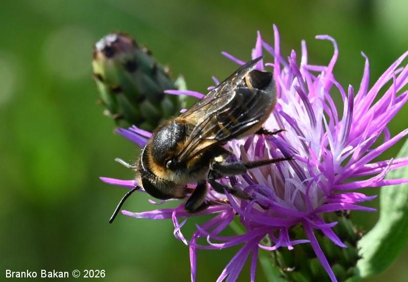 Samica: telo je pretežno črno ali črnorjavo, hrapavo. Glava je v sprednjem delu porasla s svetlimi dlakami, na temenskem delu je skoraj gola, hrapava, čeljusti so krepke, široke, s 5 zobci, nadustni ščitek (klipeus) je temen, v zgornjem delu raven do rahlo konkaven. Oprsje je krepko, po hrbtnem delu golo, hrapavo jamičasto, ob straneh poraslo s štrlečimi, pretežno rjavkastimi dlakami, v zaprsnem in podkrilnem delu gosto poraslo z belkastimi dlakami. Krila so dobro ožiljena, z dvema subapikalnima celicama, pterostigma je drobna, komaj vidna. Zadek je podaljšano jajčast, rahlo rebričast, črn, segmenti so svetlo obrobljeni (dlake so pogosto rumenkastorjave), pasovi sprednjih segmentov so pogosto v osrednjem delu prekinjeni, široko obrobljeni pa ob straneh, konica zadka (6. segment) je topo koničasta, cela in konkavna. Trebušni del zadka je gosto porasel z rdečkastimi ali oranžnimi dlakami (zelo redko tudi z belimi dlakami), ki tvorijo bralno ščetko (skopa) - te je včasih navidezno bela, zaradi nabranega peloda. Noge so temne, precej krepke, predvsem zadnje goleni so precej plosko razširjene, zadnji kolčki (coxae) in stegenca so po notranji (spodnji) strani gosteje porasla s kratkimi ščetinastimi dlakami, zadnja stopalca so porasla z rdečerjavimi ščetinami.