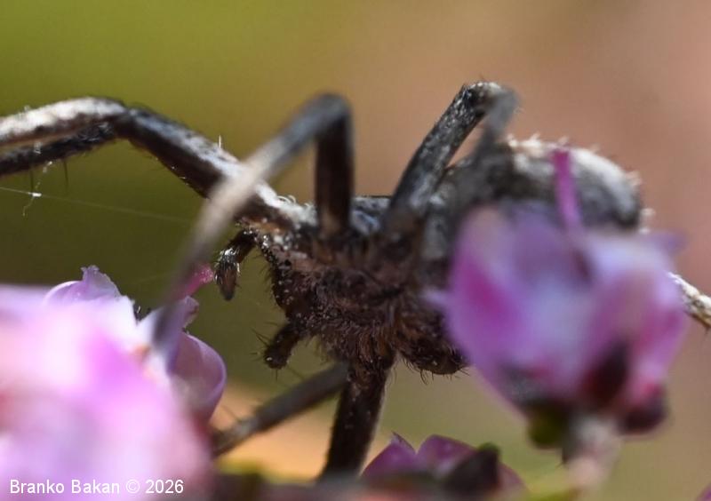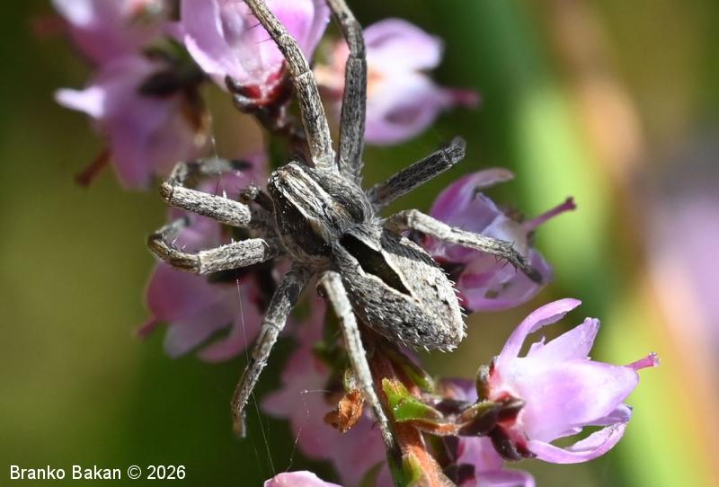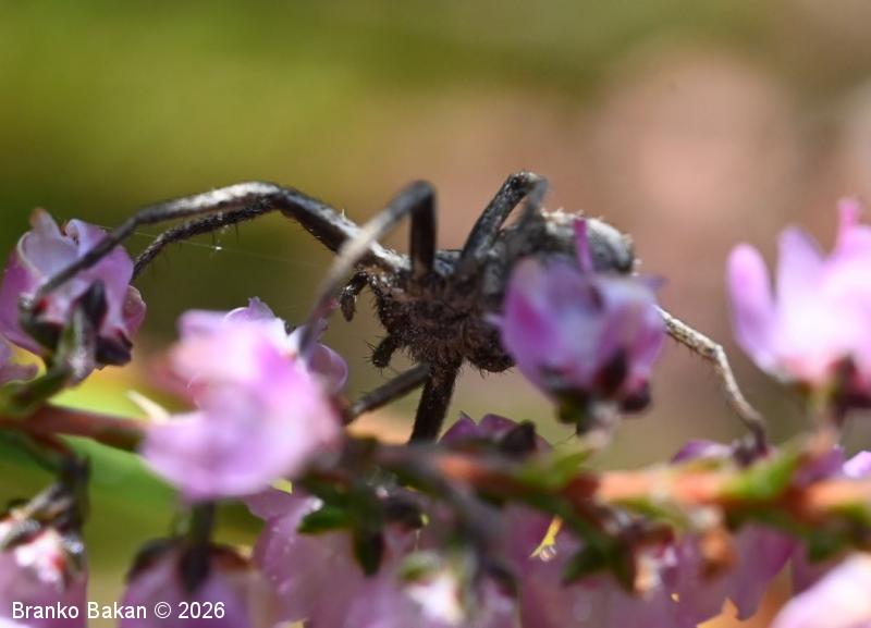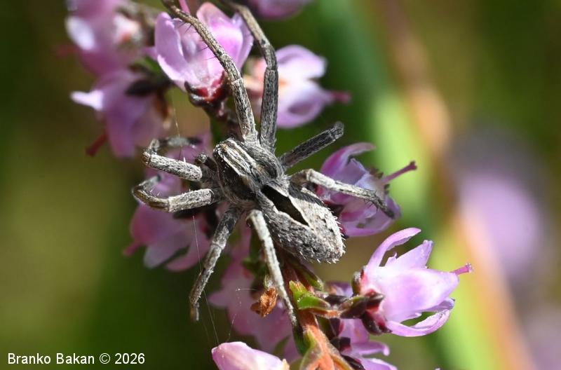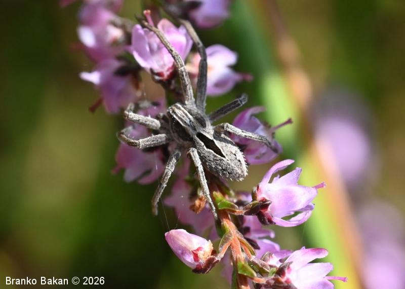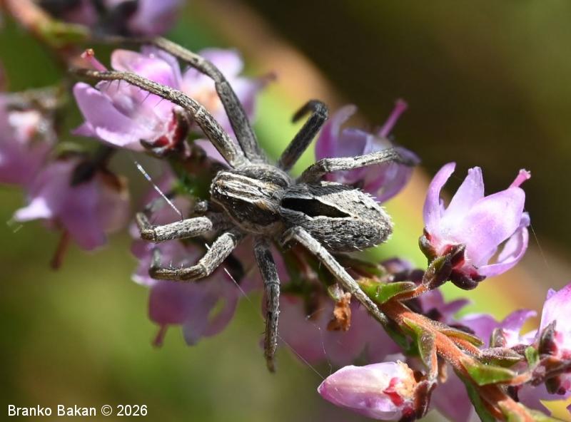 Obnašanje in razvoj: mladostni osebki so sicer podobni odrasli, vendar so pri njih vzorci na glavoprsju intenzivnejši in so bolj rjavkasti. Z vsako levitvijo postajajo čedalje svetlejši. Vrsta se pojavlja na bolj suhih mestih, se pa pojavlja tudi na mokrotnih travnikih s stožko (Molinia spp.). So aktivni plenilci, ki svoj plen napadejo iz zasede in ne pletejo lovilnih mrež. So dnevno aktivni in se večinoma zadržujejo na tleh. Svatovanje samcev vključuje tudi rahlo bobnanje s pedipali po podlagi, s čemer verjetno umirijo samico in ji naznanijo, da niso plen. Samice jajčeca izležejo v kokon, ki ga nekaj časa tudi čuvajo, dokler se ne izležejo mladiči, nato pogine. Mladiči nato tudi prezimijo.