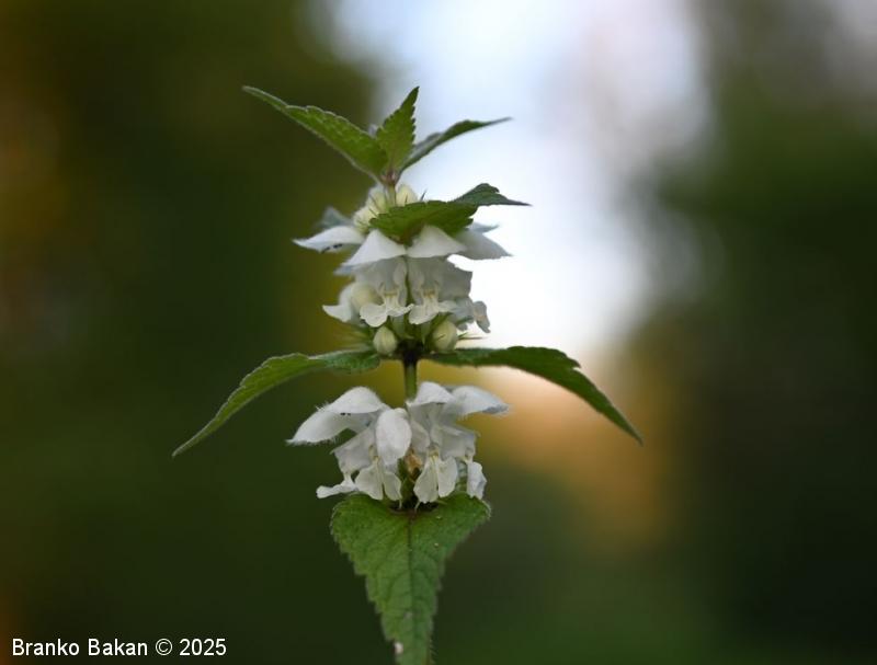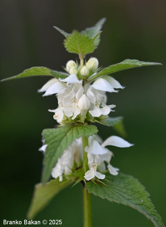 Opis: steblo pokončno, 4-robo, z dolgimi, podzemnimi pritlikami. Listi trikotni, kratkopecljati, nasprotno razvrščeni, po robu topo nazobčani, koničasti, izrazito mrežasto žilnati, z značilnim vonjem, vsi bolj ali manj enako veliki (tudi tisti proti vrhu stebla). Cvetovi dvoustnati, beli, zraslovenčni (vsi cvetni listi so med seboj zrasli v venčno cev in dve ustni), združeni v navidezna zalistna vretenca na zgornjem delu stebla. Zgornja venčna ustna žličasto upognjena, po zunanji strani dlakava, spodnja venčna ustna dvokrpa, temno lisasta. Prašniki 4, med seboj so vzporedni, vsi s prašnicami, štrlijo iz venčne cevi, vendar so krajši od zgornje venčne ustne. Čašni listi med seboj zrasli v čašno cev in podaljšani v ozke čašne zobce, ki so po robu dlakavi. Plod razpade na 4 plodiče.