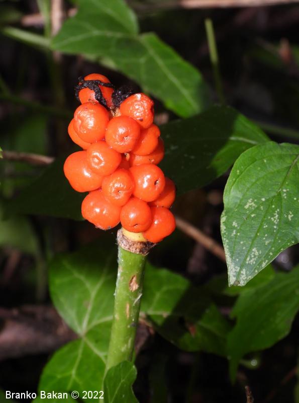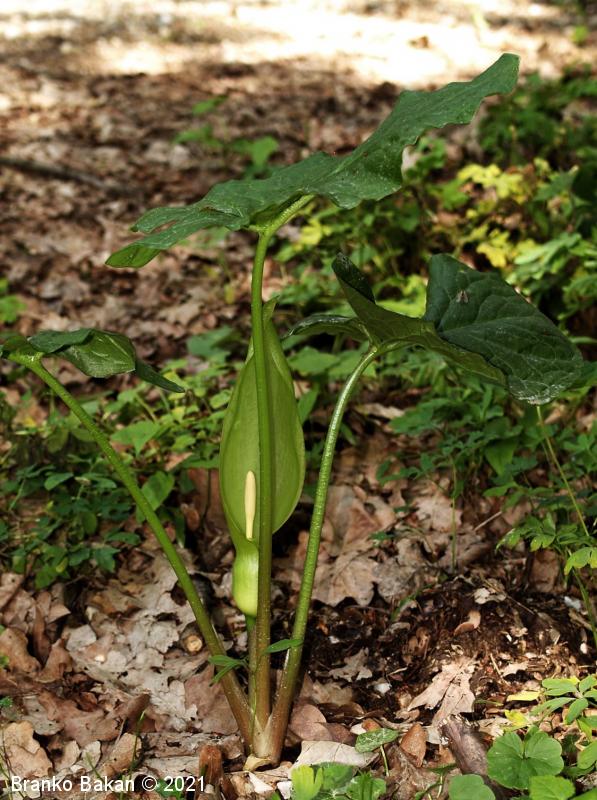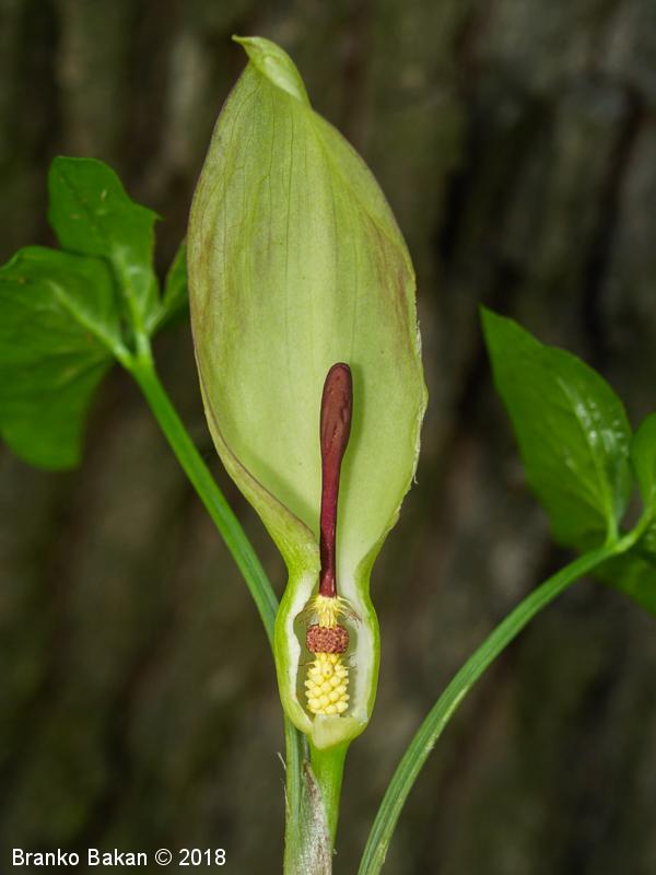 Opis: steblo podzemno, vodoravno plazeče, lomljivo. Listi sprva suličasti, kasneje puščičasti, precej veliki, dolgopecljati, pogosto s temnimi lisami, mrežasto žilnati. Peclji listov daljši od pecljatega socvetja in ga navadno po višini presegajo. Cvetovi združeni v betičasto socvetje, ki ga obdaja velik, bledo zelen do rumenkasto zelen ovršni list (spata). Ženski cvetovi brez odevala, nameščeni v več krogih, drobni, nad njimi prav tako v krogu nameščeni in brezvenčni moški cvetovi, najvišje pa so v krogih nameščeni sterilni moški cvetovi, z dolgimi nitastimi izrastki. Vrhnji del betiča nekoliko odebeljen, vijoličasto nadahnjen, ob zrelosti izrazito neprijetnega vonja, ki privablja muhe in druge dvokrilce (vonj po gnijočem mesu). Plodovi so rdeče, sočne jagode.
