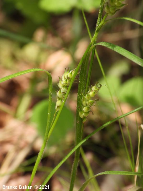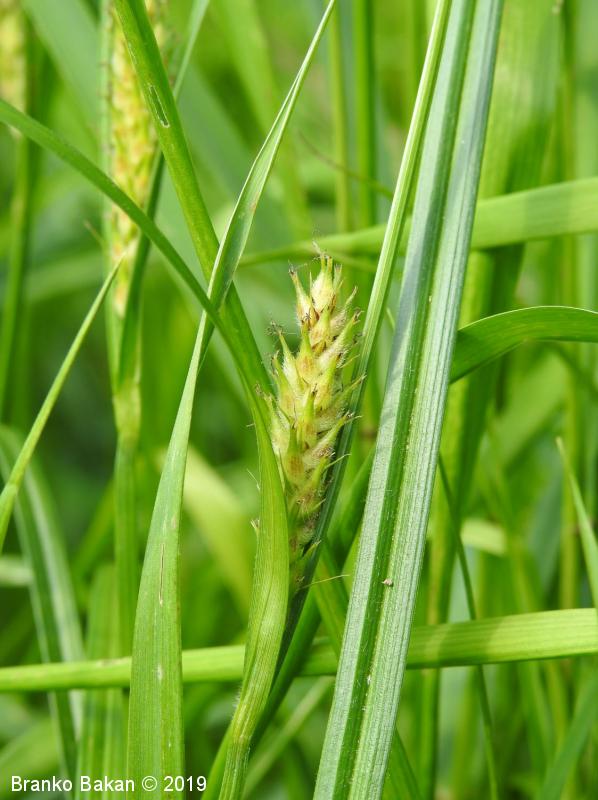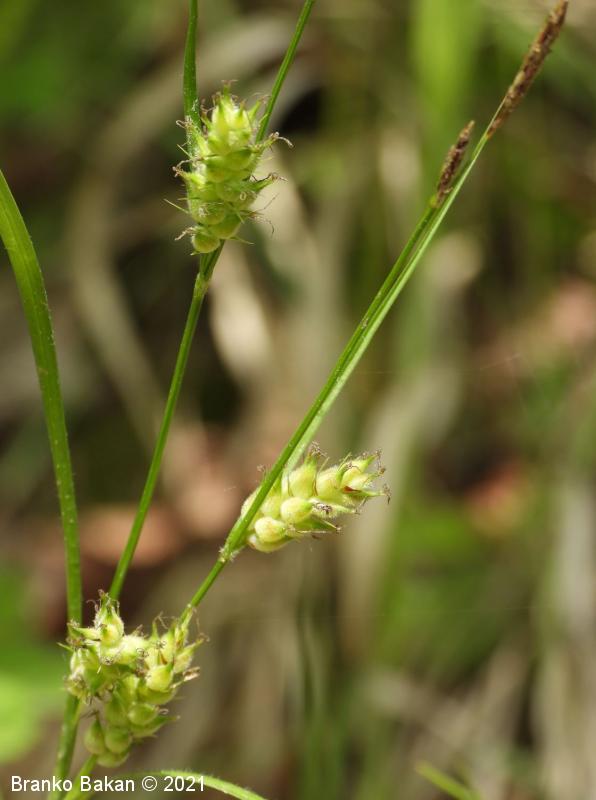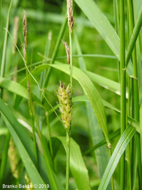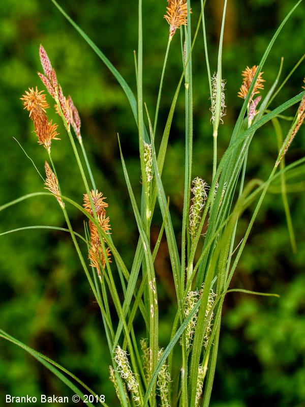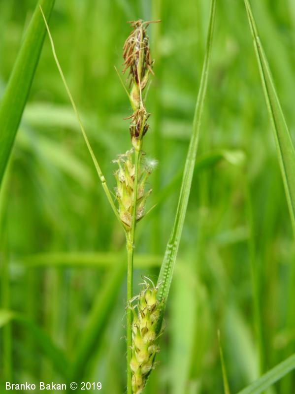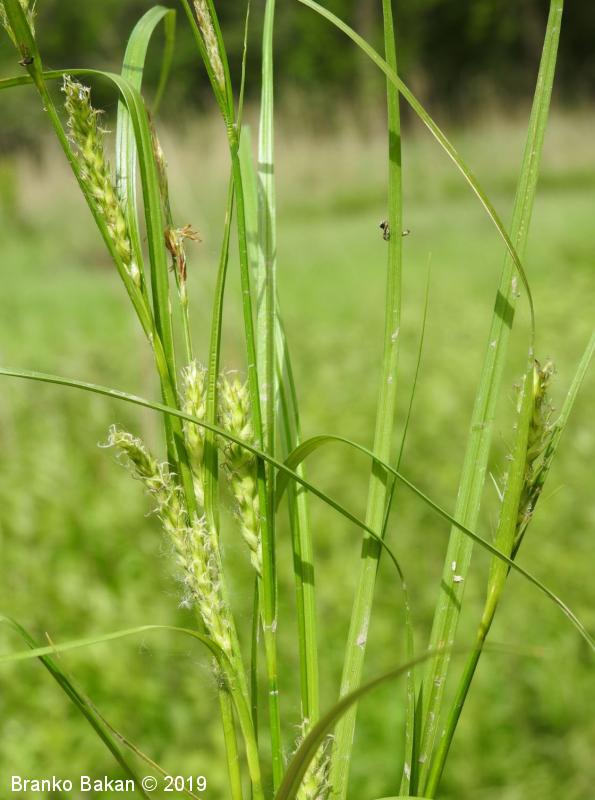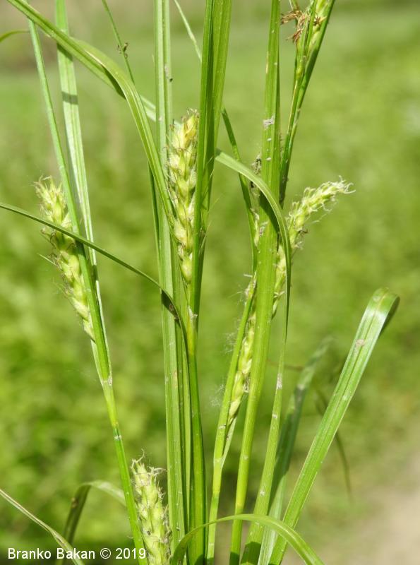 Opis: zelnata trajnica z dolgimi, podzemnimi pritlikami, zato razrast rahlo rušnata. Steblo do vrha olistano, v prerezu topo trirobo do skoraj okroglo. Listi in njihove nožnice po vsej površini kratkodlakavi. Najnižji podporni list zelen, mlahav, krajši od stebla. Klaski enospolni. Moški klaski se nahajajo na vrhu stebla, navadno po 1, redkeje več, rjavkasti. Ženski klaski zeleni, posamični, v zalistju ovršnih podpornih listov, dolgopecljati, pokončni. Mešički ženskih cvetov hruškasti, podolgovati, ob zrelosti nekoliko napihnjeni, z dolgim, preklanim kljuncem, gosto dlakavi. Podporne pleve proti vrhu razširjene, tope, zelene z rjavkastim robom.