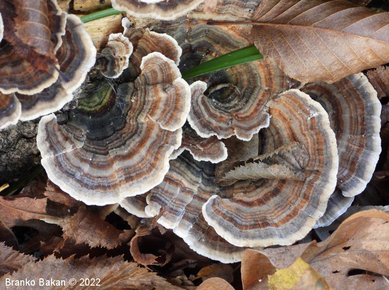 Opis: trosnjak je značilno pahljačast ali polkrožen, sploščen do plosko naguban, izrazito koncentrično pasast in pisano obarvan, najpogosteje sivkasto- do rumenorjav, s širokim belim robom, osrednji del je včasih vijoličasto nadahnjen. Iz istega micelija razrašča po več vodoravno razvrščenih in v več slojih naloženih plodišč, predvsem na razpadajočih štorih ali podrtih drevesih. Sprva je površina trosnjaka žametasta, kasneje otrdi in "oleseni". Spodnja stran (trosovnica) je luknjičasta, umazano bela do rjavkasta. Trosi so do 8 μ veliki, bledo rumenkasti do umazano beli.