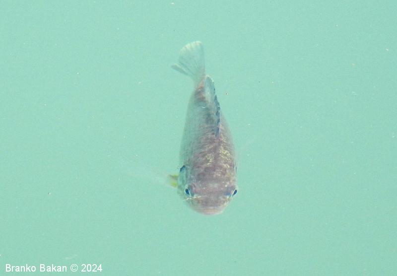 Odrasli osebki: precej pisana riba. Hrbet zelo visoko dvignjen, trup je izrazito bočno sploščen, usta so nadstojna, oči pa so pomaknjene precej naprej. Glava in škržni poklopec modra s svetlimi, turkiznimi progami, na škržnem poklopcu se nahaja velika, črna in rdeče obrobljena pika. Trup nad pobočnico je prelivajočih se olivno modrih barv s temnejšimi luskami, trebuh in spodnji del bokov rumen z rdečimi pikami. Hrbtna plavut precej dolga, rumena, z rdečkastimi pikami, v sprednjem delu sestavljena iz bodečih osti, v zadnjem delu iz mehkejših. Predrepna plavut je prav tako dokaj dolga in široka, sestavljena iz togih in mehkih osti. Repna plavut je delno nesimetrična, zgornji del je namreč nekoliko večji od spodnjega.
