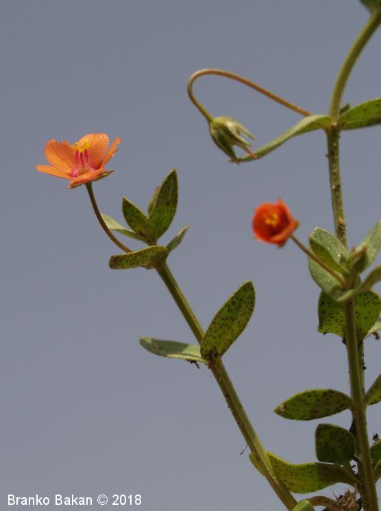Opis: plazeča, močno razrasla enoletnica. Steblo v prerezu robato, golo. Listi jajčasti, celorobi, goli, prosojno črno pikčasti, nepecljati, nasprotno razvrščeni. Cvetovi navadno po 2 skupaj, v zalistjih, dolgopecljati (peclji do 2-krat daljši kot podporni list), 5-števni. Venčni listi karminasto rdeči, redkeje tudi modri, po robu kratko resasti in žlezasto dlakavi, med seboj zrasli. Plodna glavica je mnogosemenska, okrogla, gola, odpira se s prečno loputo.