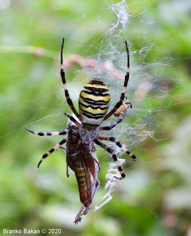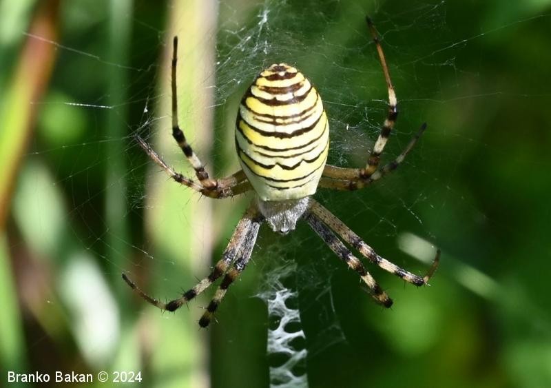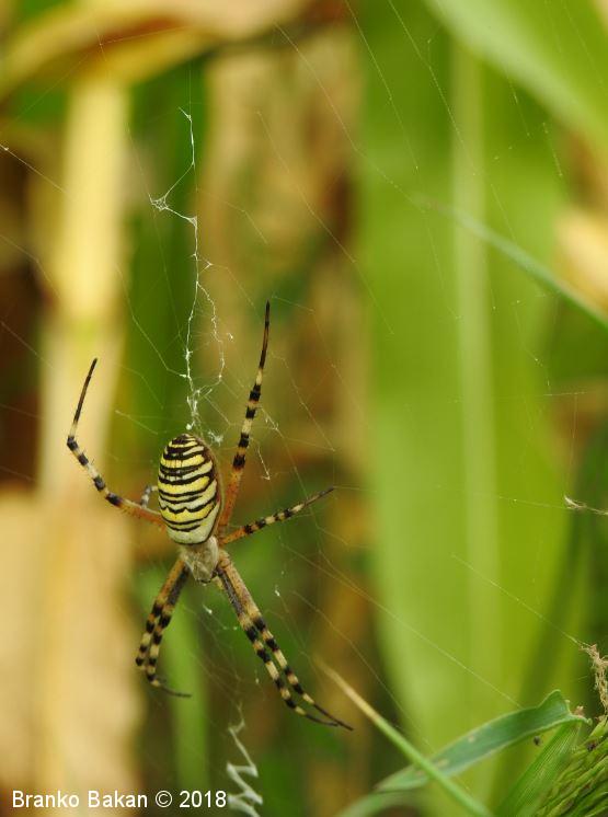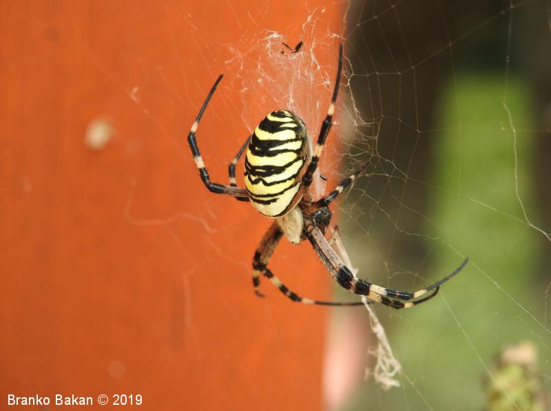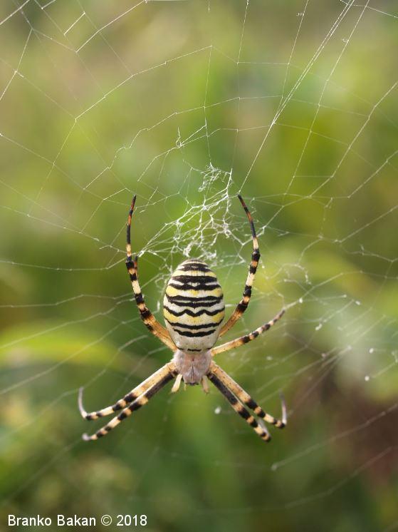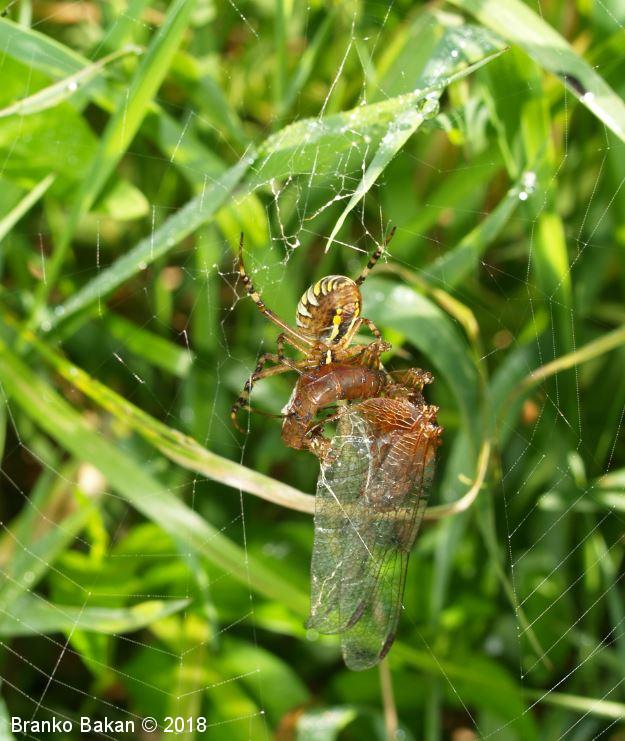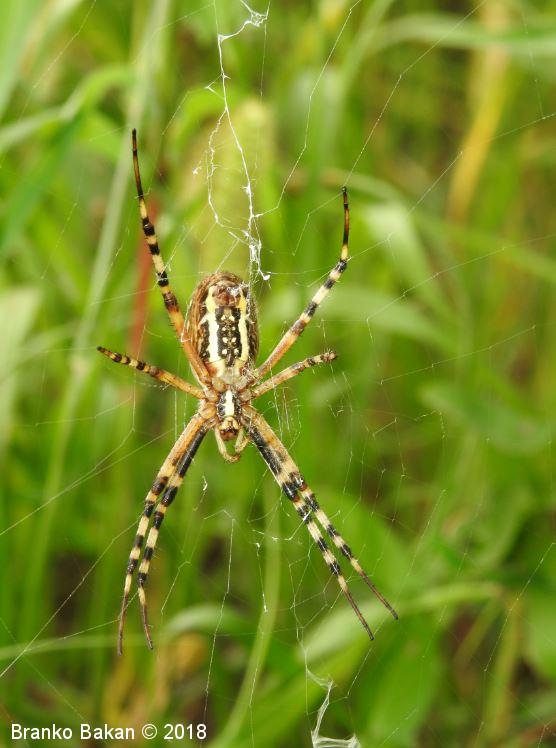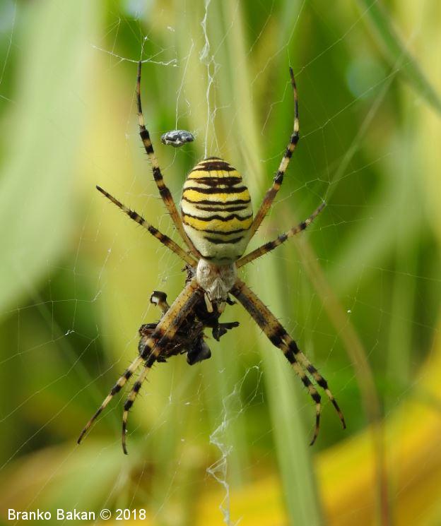 Samica: precej velika, z dolgimi, tankimi nogami. Glavoprsje sivkasto rjavo, gosto pokrito s svilnatimi dlačicami, v primerjavi z zadkom dokaj majhno. Zadek precej velik, valjasto jajčast, z izrazito črno-rumeno-belo pasastim vzorcem, ki spominja na vzorec pri osah. Hodilne noge bledo rjave, črno pasasto vzorčaste.
