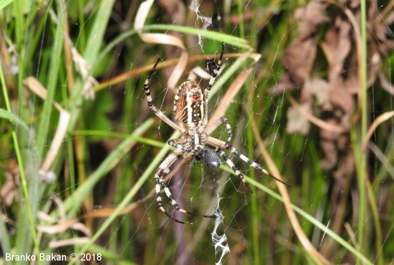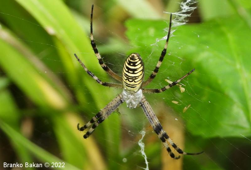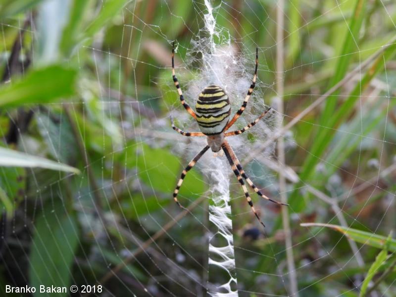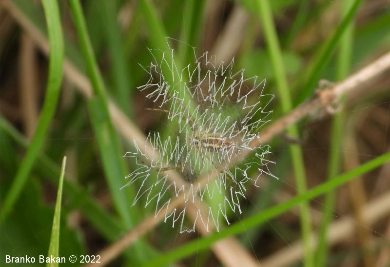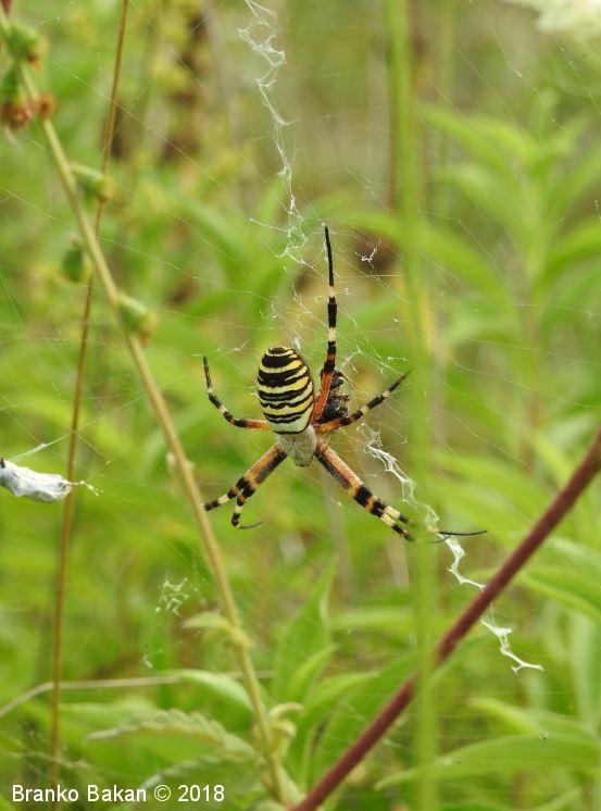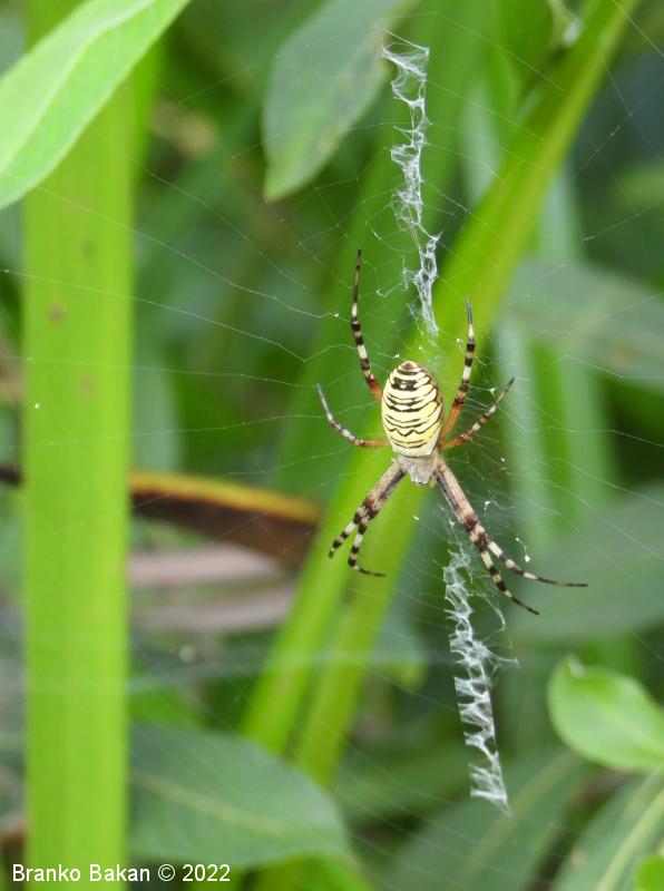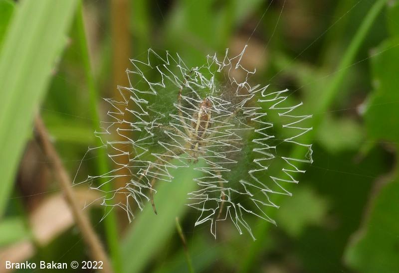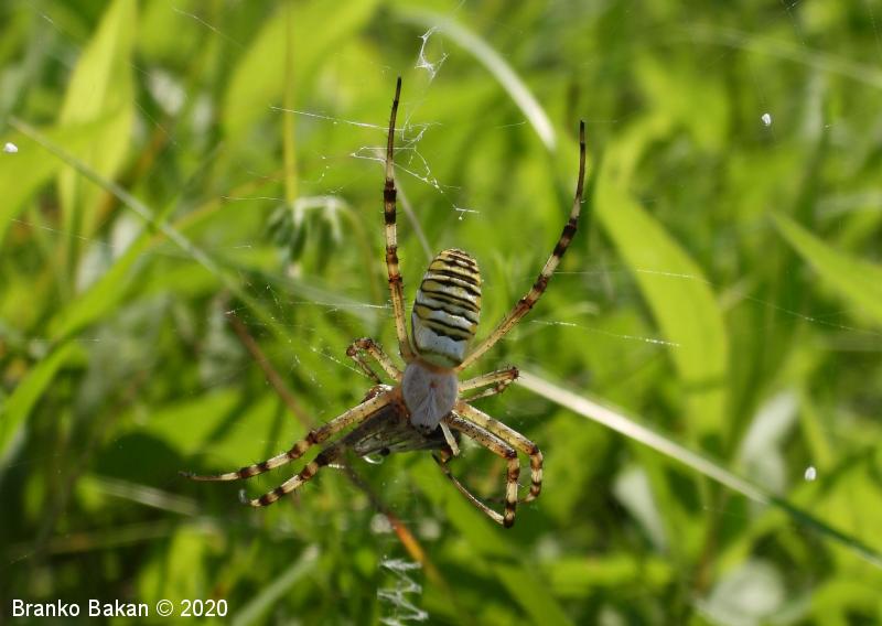 Samica: precej velika, z dolgimi, tankimi nogami. Glavoprsje sivkasto rjavo, gosto pokrito s svilnatimi dlačicami, v primerjavi z zadkom dokaj majhno. Zadek precej velik, valjasto jajčast, z izrazito črno-rumeno-belo pasastim vzorcem, ki spominja na vzorec pri osah. Hodilne noge bledo rjave, črno pasasto vzorčaste.