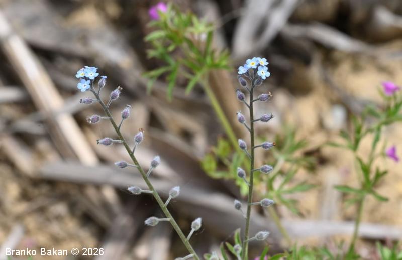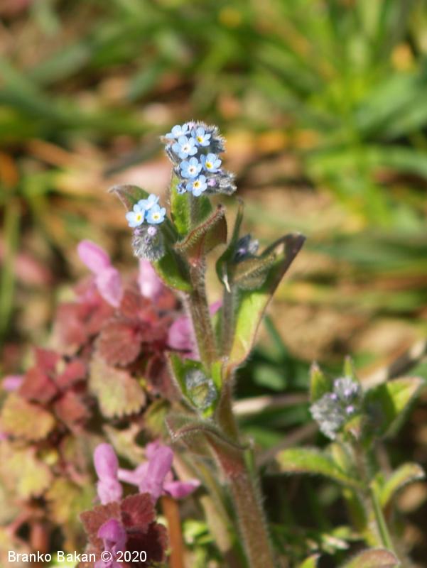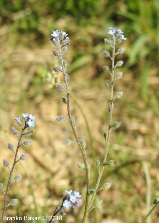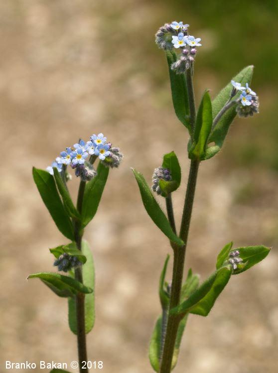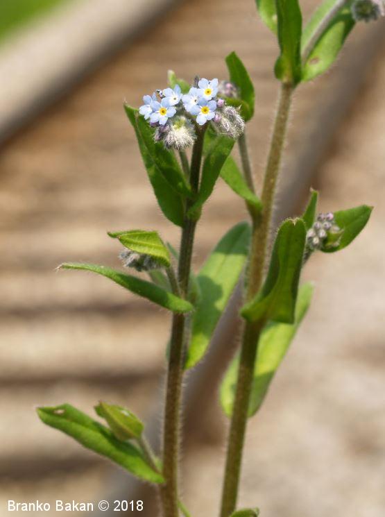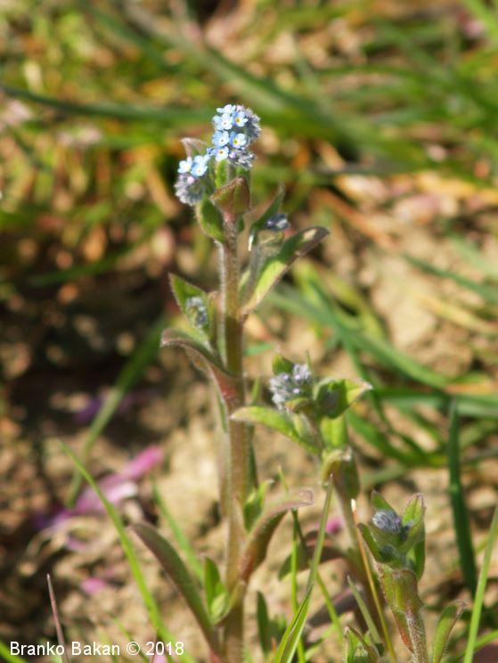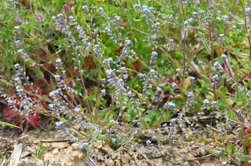 Opis: pokončna, nekoliko razrasla enoletnica. Steblo okroglo, gosto srhkodlakavo (dlake ščetinaste, prilegle ob steblo ali štrleče), pogosto rdečkasto nadahnjeno, predvsem v spodnjem delu gosto olistano in s pritlično listno rozeto. Listi premenjalno razvrščeni, lopatičasto suličasti, celi, sedeči ali podaljšani v širok pecelj, gosto srhkodlakavi. Socvetje je enostaven vijaček (cvetovi so nameščeni vzdolž ene strani socvetja, v mladosti je spiralasto zvito). Cvetovi drobni, do 4 mm veliki, sinjemodri z rumenkastim goltom, 5-števni, pladnjasto razprostrti, pecljati (peclji po odcvetu vsaj 2-krat daljši od čaše), brez podpornih listov. Venec med seboj zrasel v venčne krpe in v venčno cev, ki je tako dolga kot čašni listi. Čašni listi med seboj zrasli v čašno cev, čašni roglji ozki, črtalasti, štrleče ščetinasti, ob zrelosti plodu zapirajo vhod vanj. Plod razpade na 4 plodiče.