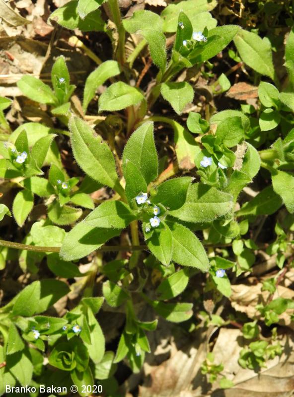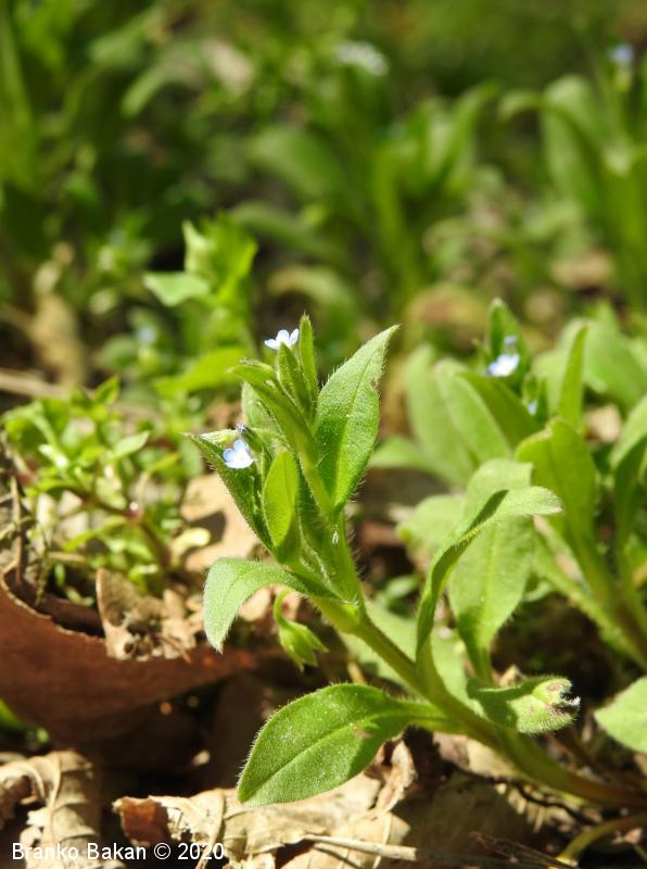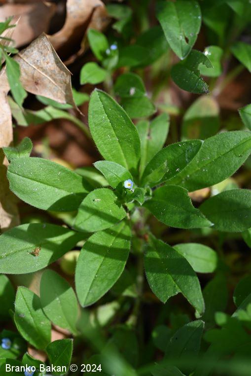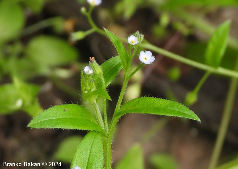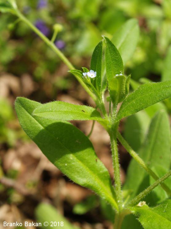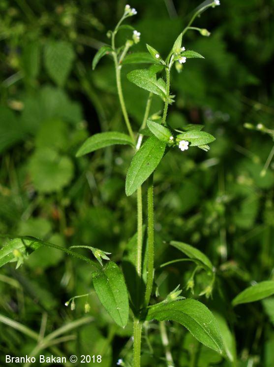 Opis: pokončna, močno razrasla enoletnica. Steblo je robato, krhko, raztreseno srhkodlakavo (dlake ščetinaste, štrleče), včasih s pritlično listno rozeto. Listi so premenjalno razvrščeni, lopatičasto suličasti, celi, sedeči ali podaljšani v širok pecelj, raztreseno togo srhkodlakavi. Socvetje je razrasel, malocveten vijaček (cvetovi so nameščeni vzdolž ene strani socvetja, v mladosti je spiralasto zvito). Cvetovi so drobni, do 4 mm veliki, bledomodri do skoraj beli z rumenkastim goltom, 5-števni, pladnjasto razprostrti, dolgopecljati (peclji po odcvetu do 3-krat daljši od čaše, navzdol zasukani), vsaj spodnji cvetovi z velikimi podpornimi listi. Venec med seboj zrasel v venčne krpe in v venčno cev, ki je nekoliko daljša od čašnih listov. Čašni listi med seboj zrasli v čašno cev, čašni roglji ozki, črtalasti, togo ščetinasti, ob zrelosti plodu široko razprostrti. Plod razpade na 4 plodiče.