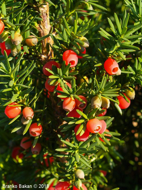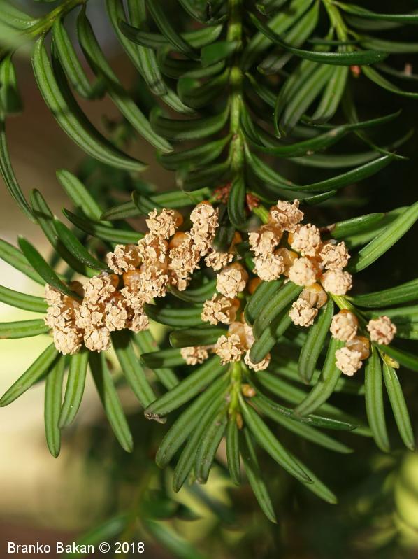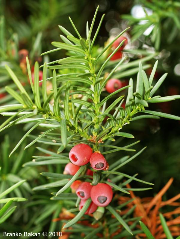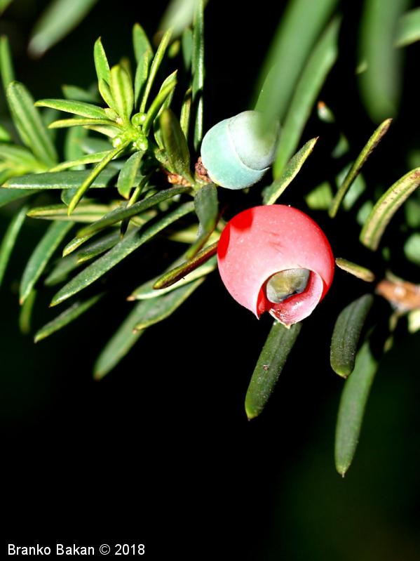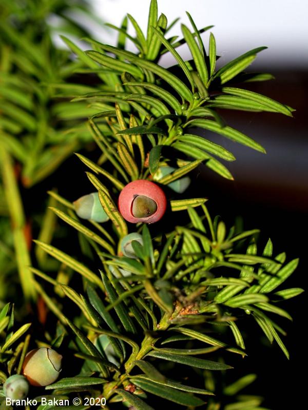 Opis: dvodomno drevo ali grm z bogato krošnjo. Lubje ni smolnato, lušči se v zaplatah. Iglice bleščeče temnozelene, po spodnji strani svetlejše, nebodeče, prožne, vodoravno razporejene, rahlo ukrivljene, s prav kratkim pecljem, do 3.5 cm velike. Moški cvetovi posamični, rumenkasto rjavi, s 6 do 14 prašniki, razvijejo se na vrhu poganjkov. Ženski cvetovi prav tako posamični, z eno semensko zasnovo, ki jo na bazi obdajajo zelo majhne luske. Zrelo seme navidez "koščičasto" in je obdano z rdečim, mesnatim ovojem (arilus), zato celotna struktura spominja na plod.