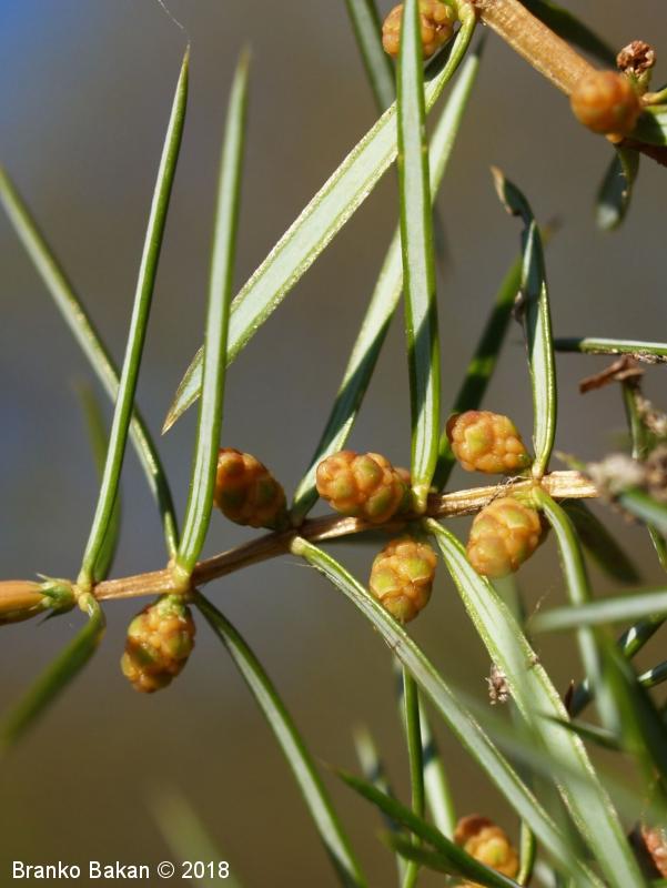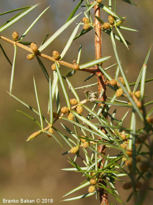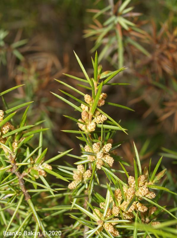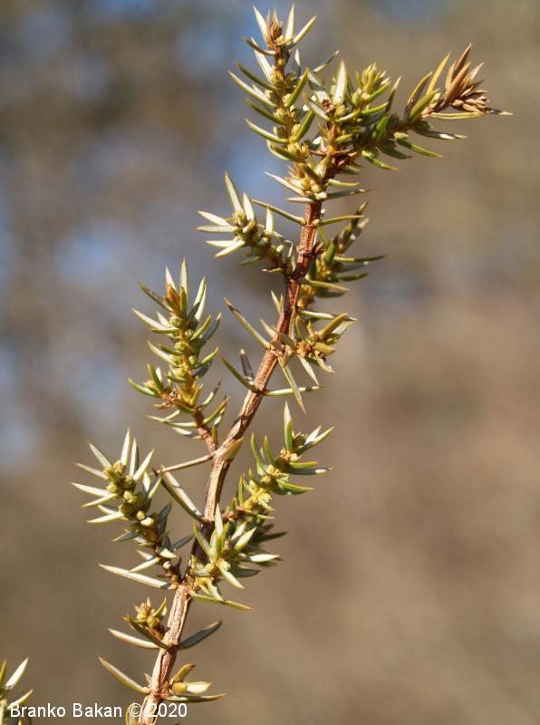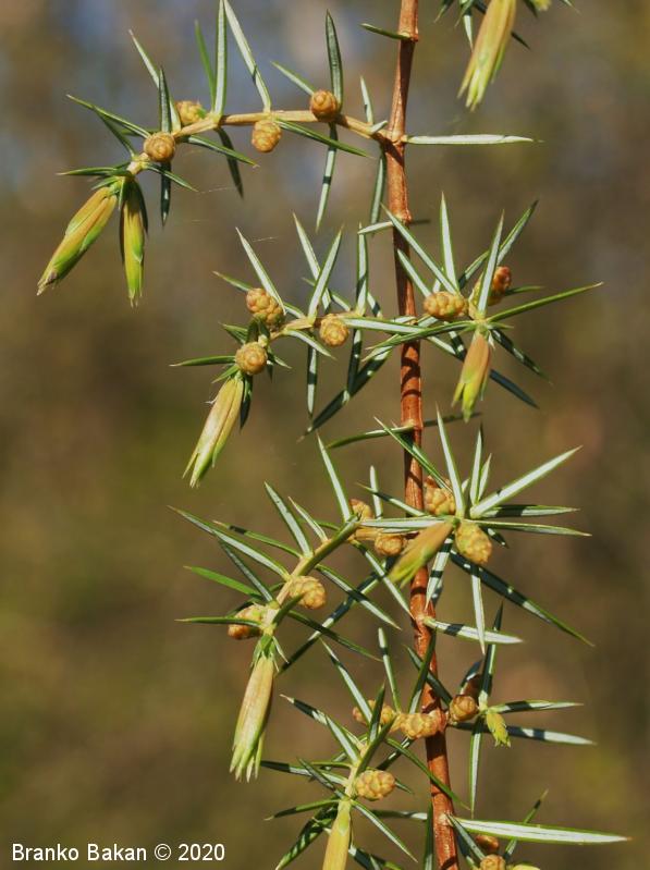 Opis: močno razrasel ali piramidasto oblikovan, bodeč grm, redkeje drevo s krošnjo. Iglice po 3 skupaj v vretencu, togo štrleče, bodeče priostrene, po spodnji strani z belo progo, do 2 cm dolge. Cvetovi enospolni, moški s po 3 do 5 pelodnimi vrečkami. Ženski cvetovi s po dvema, redkeje več semenskimi zasnovami, ob zrelosti dozorijo v mesnate storžke ("brinove jagode"), ki so črnomodri, s sinjim poprhom.