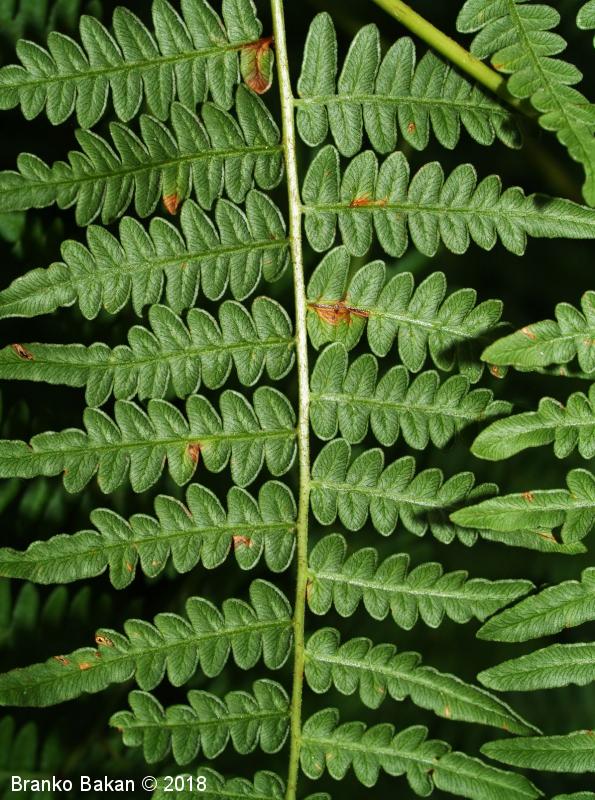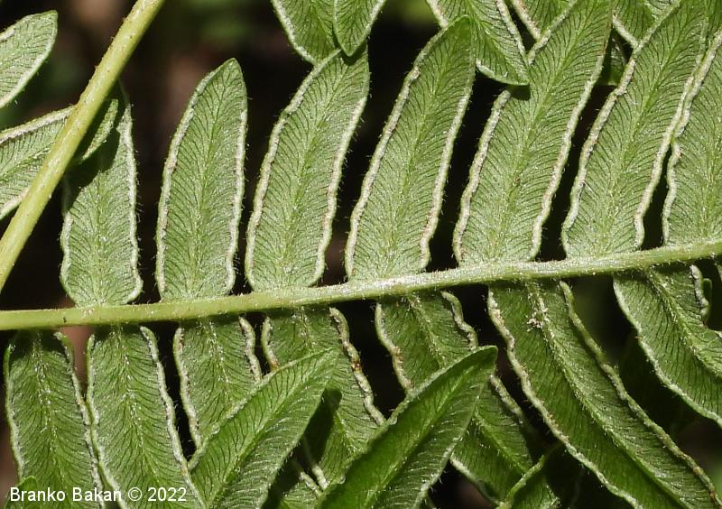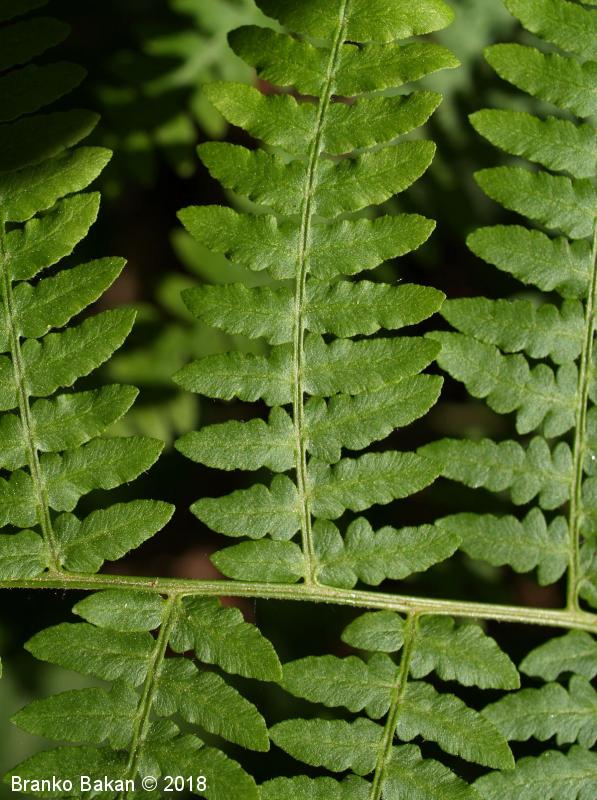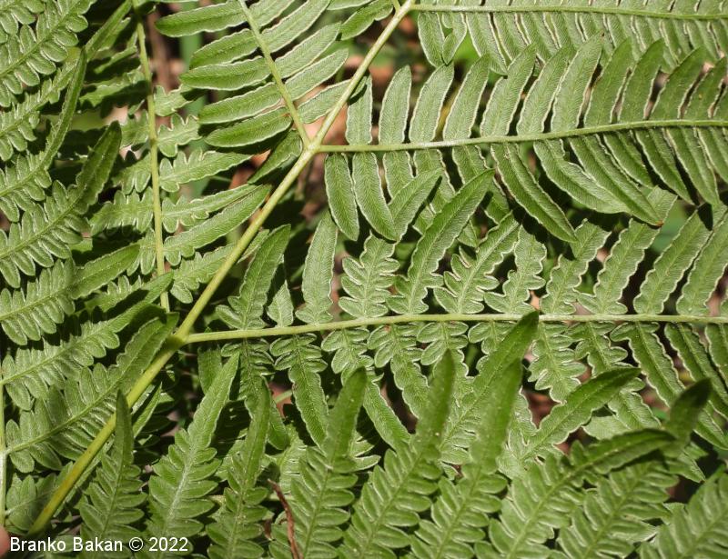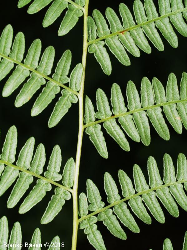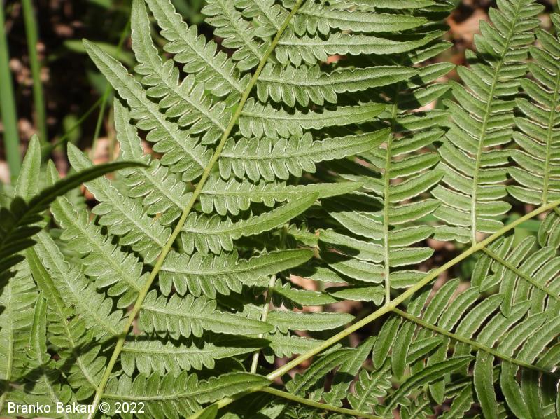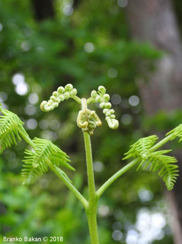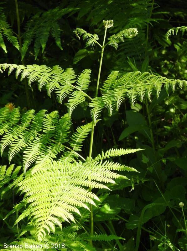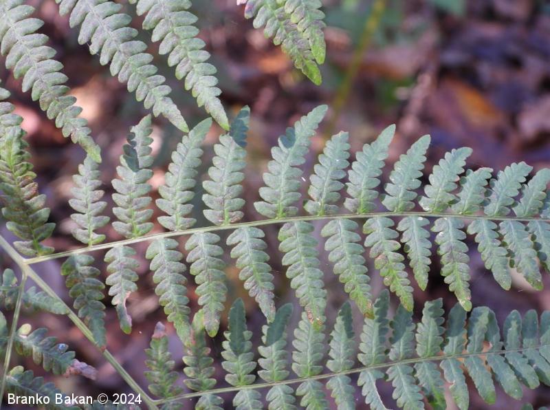 Opis: en sam velik, dolgopecljat list izrašča iz plazečega, podzemnega stebla (rizoma) in je 3-krat pernato sestavljen, v obrisu trikoten, z dokaj velikimi, trikotnimi segmenti prvega reda. Segmenti zadnjega reda so črtalasto podolgasti, celorobi ali valovito plitvo nazobčani, z navzdol uvihanim robom, ki zakriva trosišča.