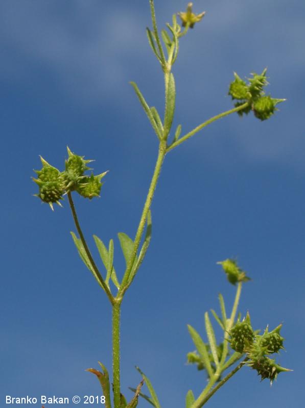 Opis: gola do redkodlakava enoletnica. Spodnji stebelni listi trojnati, segmenti lopatičasti do trikotni, krpati ali globoko nacepljeni, bleščeči, nekoliko mesnati, dokaj zgodaj propadejo. Zgornji stebelni listi trojnati, deljeni v ozkočrtalaste, plitvokrpate segmente, blaščeči, nekoliko mesnati. Cvetovi do 1 cm veliki, bledorumeni. Čašni listi obrnjeni navzgor, prilegli k venčnim listom, po zunanji strani dlakavi. Plodov je malo, od 3 do 10, so bočno stisnjeni orešk, ob zrelosti izrazito bodičasti in z dolgim, skoraj ravnim kljuncem.