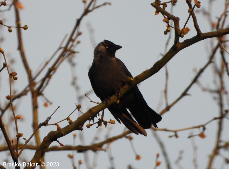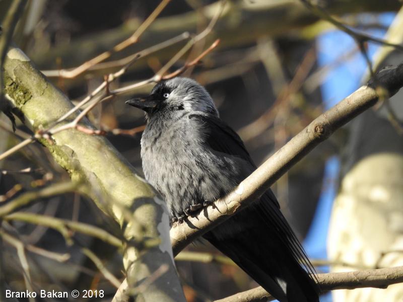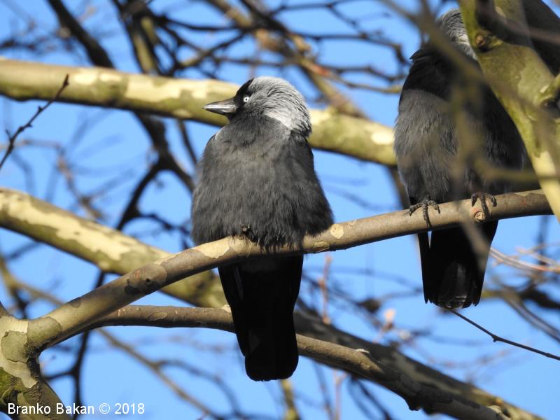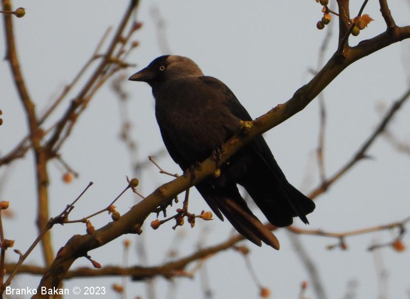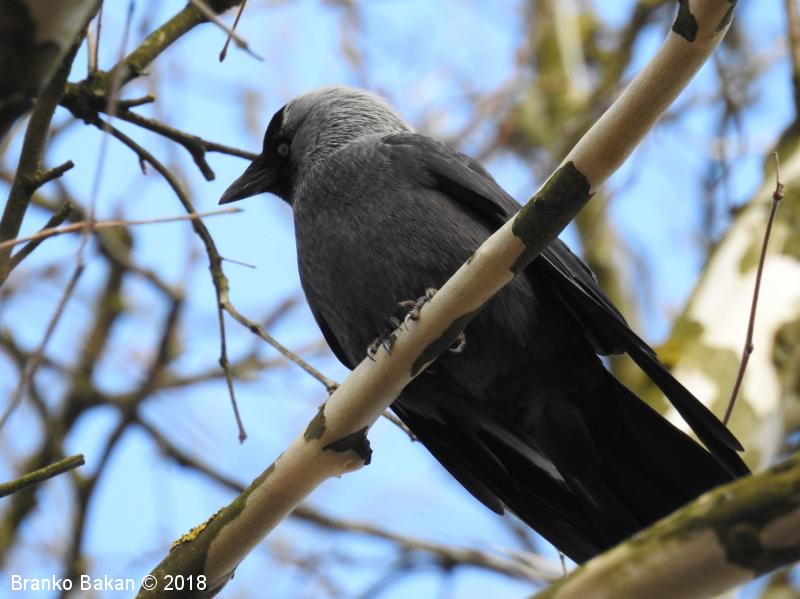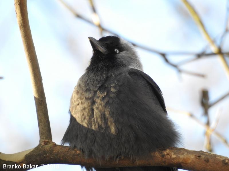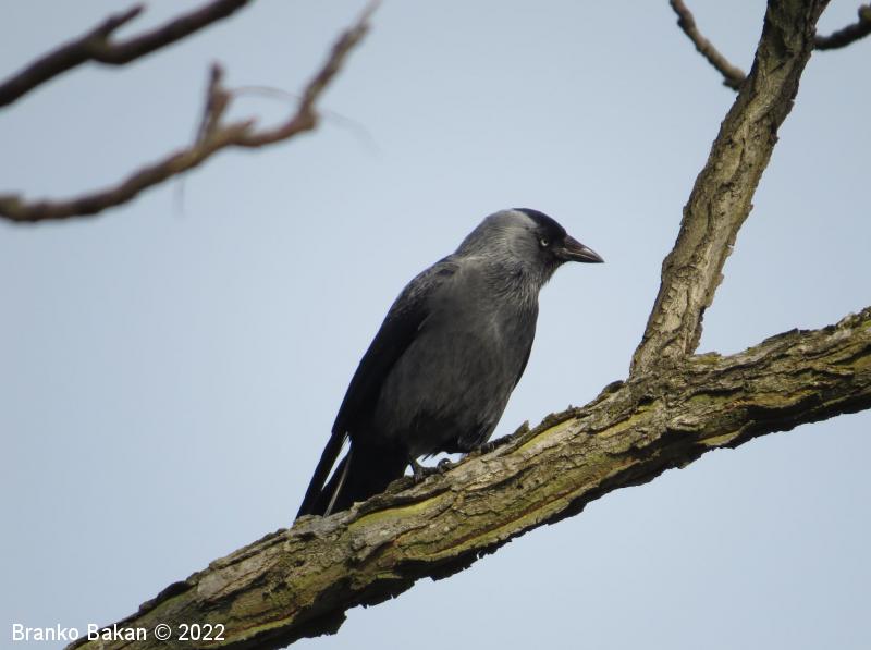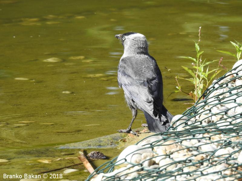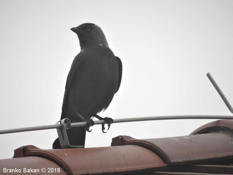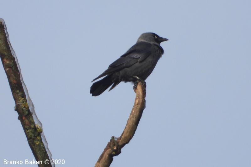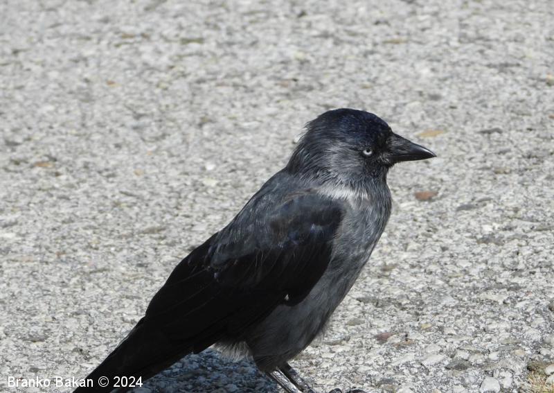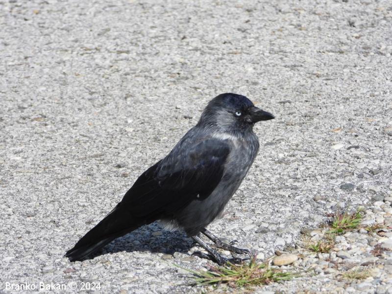 Odrasli: samec in samica sta podobna. Prevladuje sivo-črna barva perja. Čelo in podbradek izrazito temna, ostali del glave dosti svetlejši od ostalega telesa. Oko izrazito svetlo, modrikasto. Kljun kratek, močan, črn. Peruti enovito temne, dokaj kratke in široke. Tudi noge sorazmerno kratke, črne.