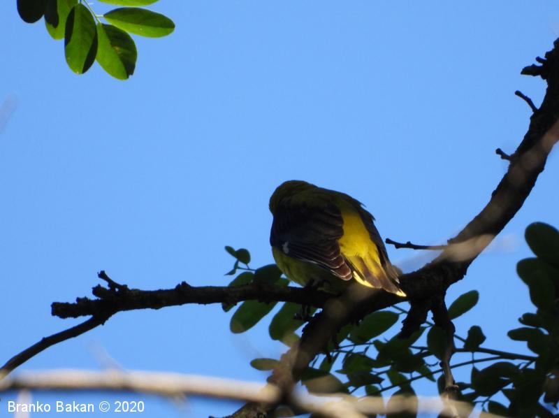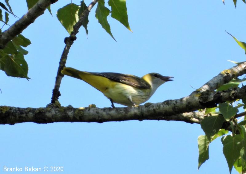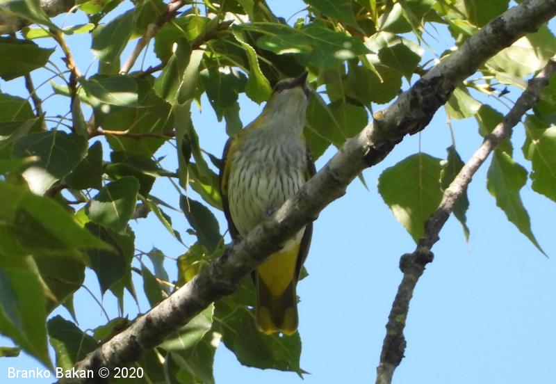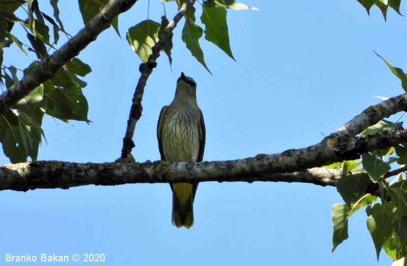 Samica: po temenu in hrbtu olivnozelena do rumenozelena. Grlo belo, rahlo progasto. Boki rumeni, trebuh bel, oboji vzdolžno progasti. Primarna peresa v krilih temna, skoraj črna, ostala peresa olivnozelena. Proga v primarnih letalnih peresih je belkasta. Rep kot pri samcu, le da je bolj olivne barve. Starejše samice so lahko mnogo bolj rumeno obarvane in skoraj brez prog, zato zelo podobne samcem.