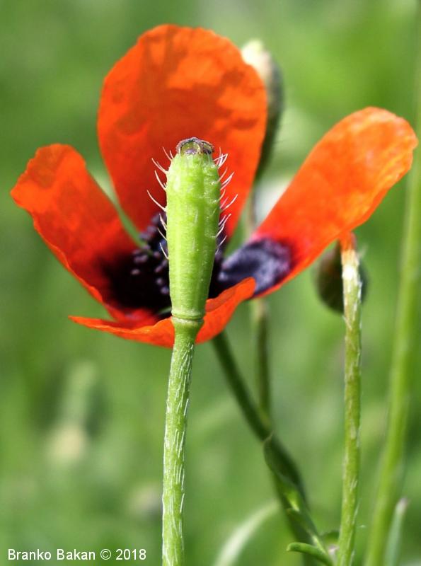 Opis: enoletnica s pokončnim, štrleče dlakavim steblom, ki vsebuje bel mleček. Listi 1-krat deljeni v nacepljene, jajčaste segmente, pecljati, gosto dlakavi, premenjalno razvrščeni. Cvetovi 4-števni, redko tudi 5-števni, 2-4 cm veliki, bleščeče rdeči do rdečeoranžni, v sredini bleščeče črnomodri. Venčni listi klinasto zoženi, med seboj navadno razmaknjeni. Čašna lista 2, zgodaj odpadeta. Prašniki številni, s kijasto razširjenimi prašničnimi nitmi in modrimi prašnicami. Plod je mnogosemenska, podolgaovato kijasta, do 2 cm velika glavica, na redko porasla z dolgimi, štrlečimi ščetinami.