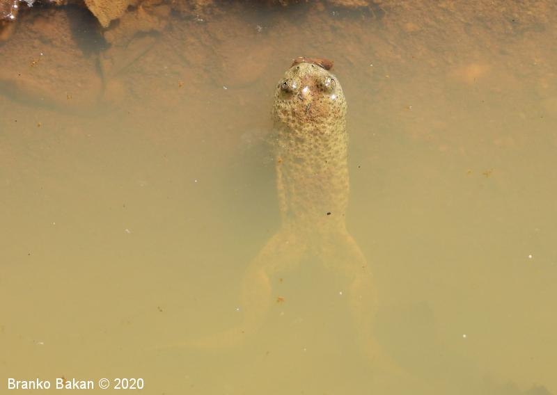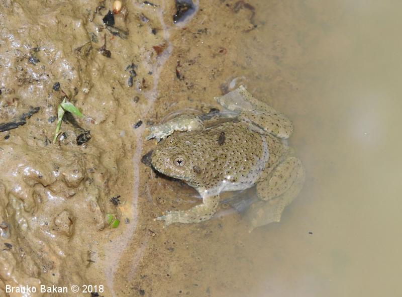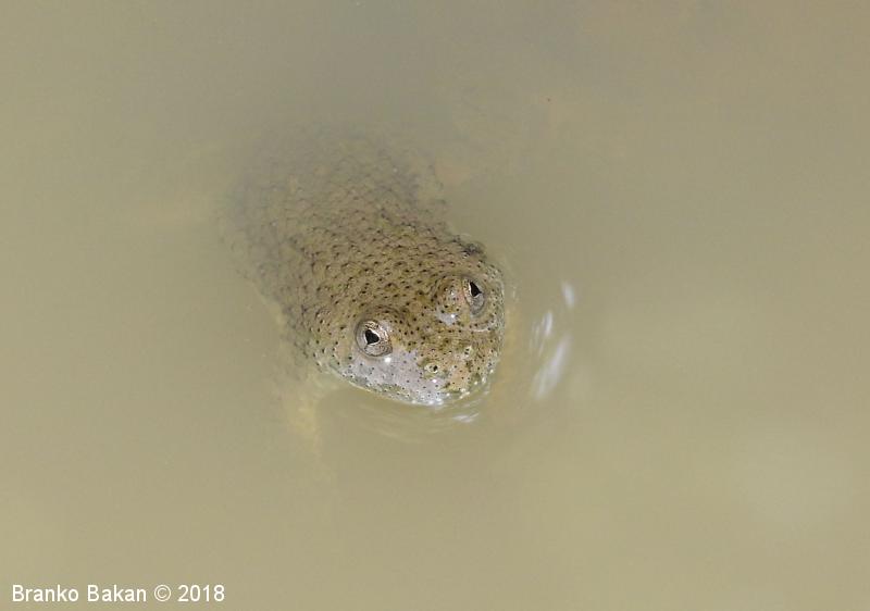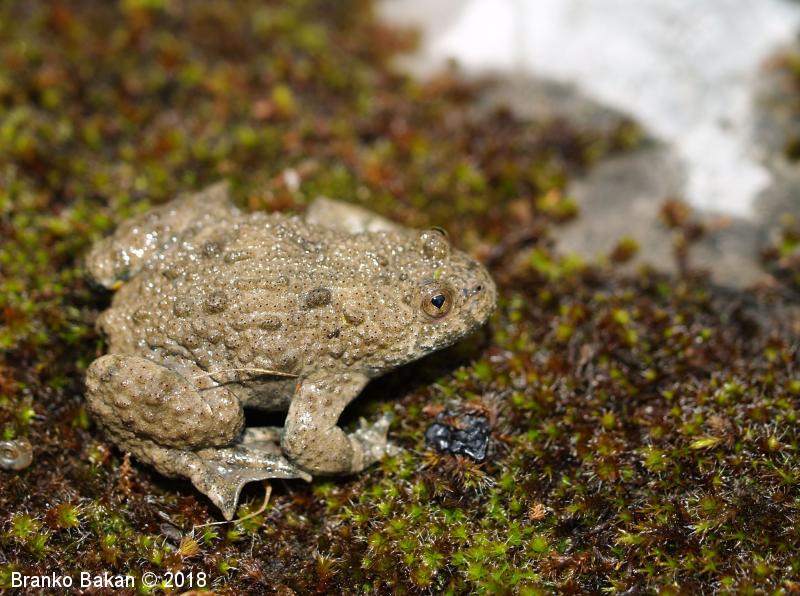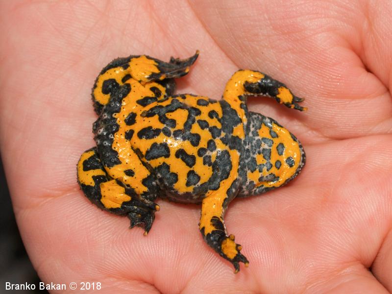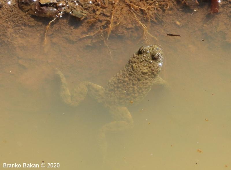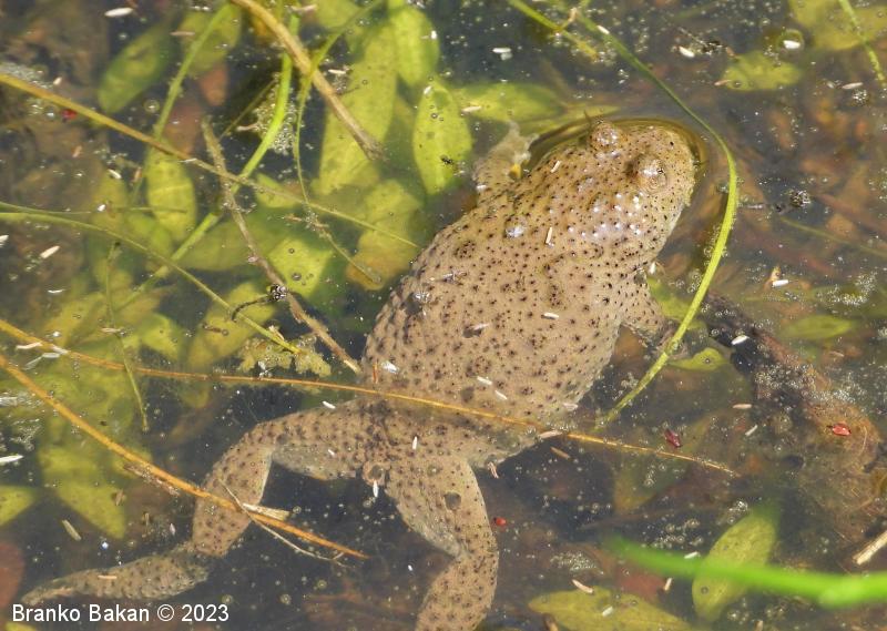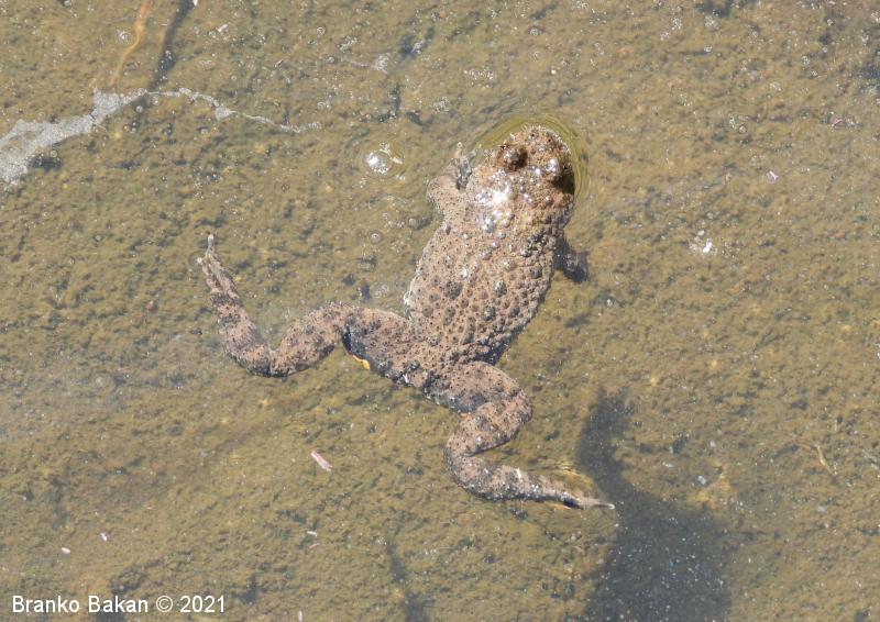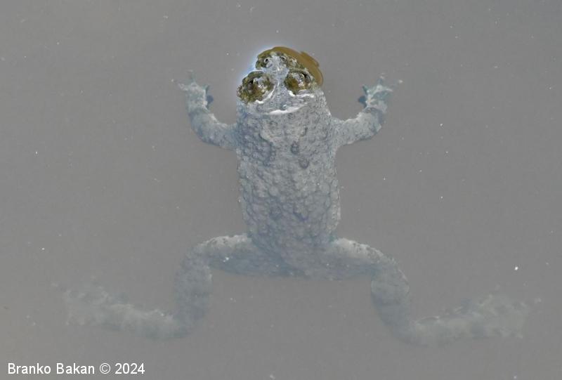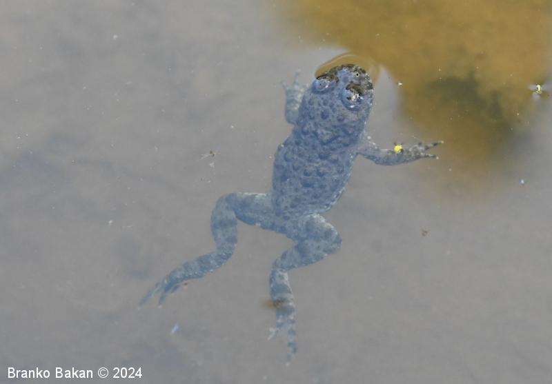 Odrasli osebki: telo je po hrbtni strani enovito sivorjave barve, izrazito bradavičasto, po trebušni strani je črno, z večjimi, rumenimi lisami, ki se pogosto med seboj lahko zlijejo v veliko osrednjo liso. Bele pike po trebuhu manjkajo ali jih je zelo malo. Zenica v očeh je srčaste oblike. Vsi prsti na prednjih nogah z rumeno konico, barva na palcu se zlije v večjo liso, ki sega na dlan. Tudi konice prstov na zadnjih nogah so rumeno obarvane. Samci imajo na sprednjih nogah kožnato odebelitev s pomočjo katere se oprimejo samice v času parjenja.
