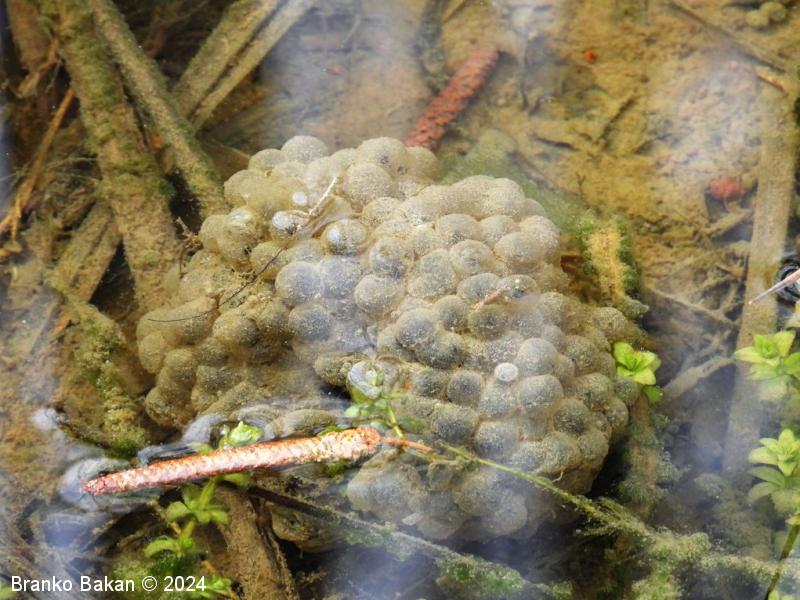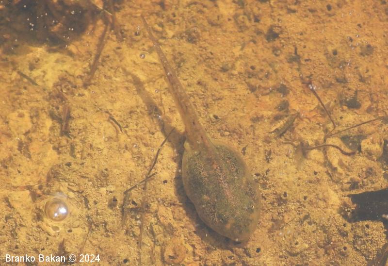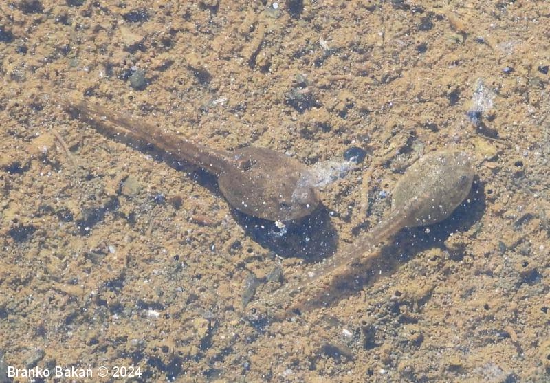 Ličinke in mrest: mrest je navadno pritjen na rastline in je nanizan v obliki vrvic, čeprav so jajčeca videti, kot da gre za skupke posameznih jajčec. V mrestu se nahaja okrog 15 jajc, redkeje tudi do 60 jajc. Paglavci (ličinke) so do 5 cm veliki, sivorjavo, lisasto pigmentirano. Manjši paglavci imajo na glavi pred očmi rumeni progi, večji paglavci ju nimajo več. Hrbtni greben sega pri manjših paglavcih od začetka hrbtišča do konice repa in se izteza po spodnji strani vse do trebuha, pri večjih paglavcih sega na zgornji strani vse so temena glave.