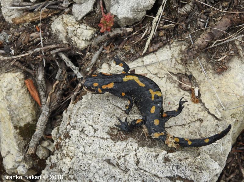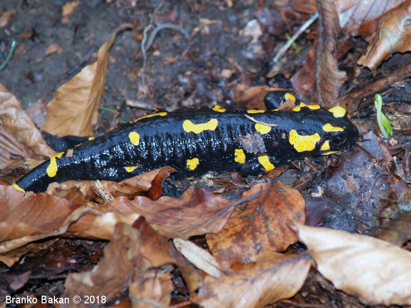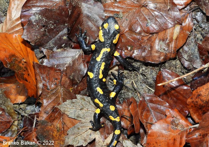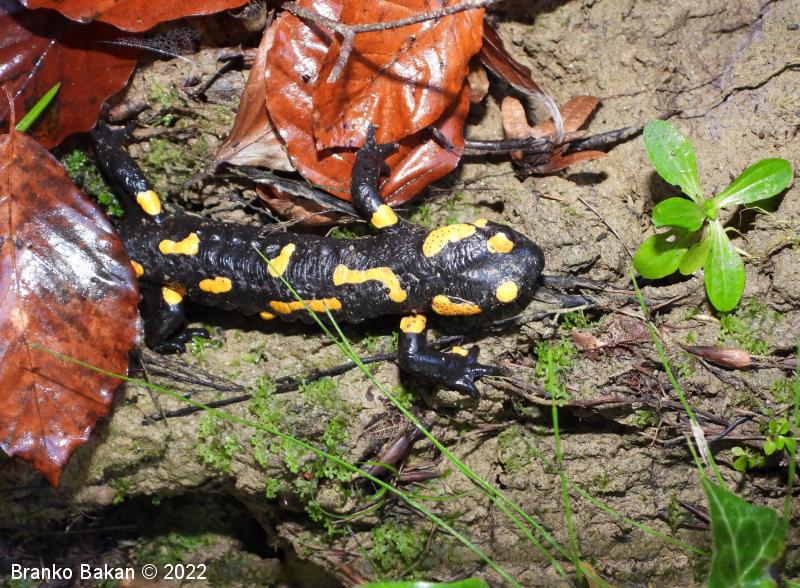 Odrasli osebki: samec in samica sta podobna, samice so navadno večje od samcev. Telo je bleščeče črne barve z rumenimi lisami, pri čemer so lahko nekateri osebki popolnoma črni, spet drugi skoraj v celoti rumeni. Za očmi se nahajajo polmesečaste, rumene, zaušesne žleze, ki imajo številne drobne luknjice (pore). Telo dokaj dolgo, valjasto, z dobro vidnimi rebri in precej široko glavo. Noge kratke, debele. Rep v prerezu skoraj okrogel, za dobro tretjino ostalega telesa. Na hrbtu ni grebena kot pri pupkih.