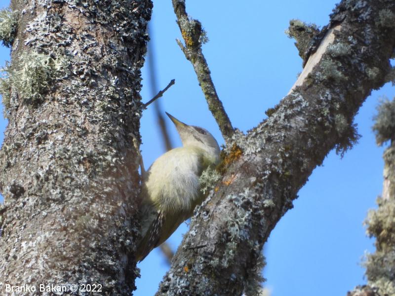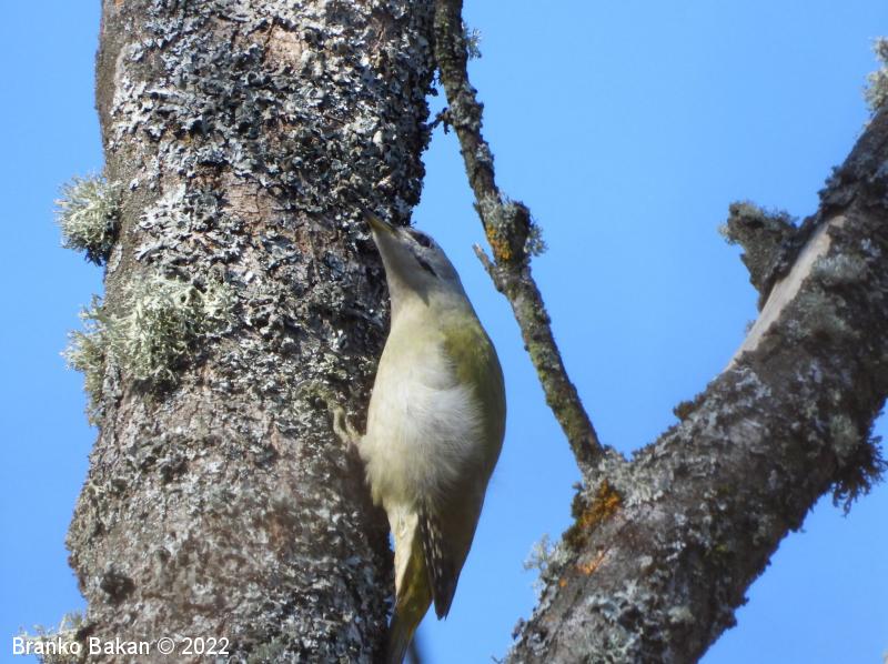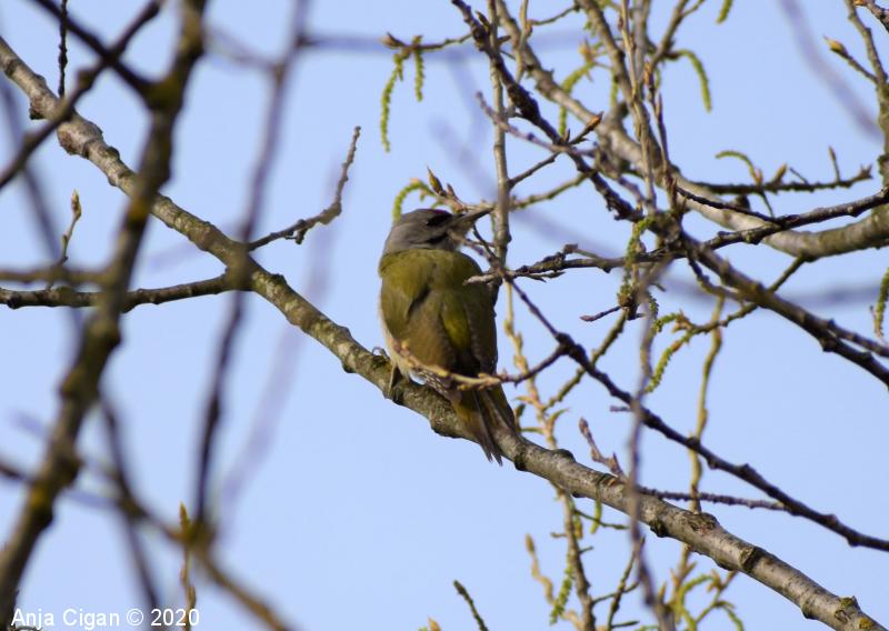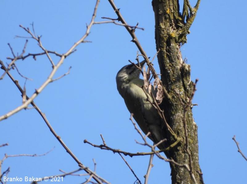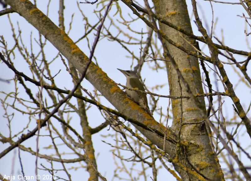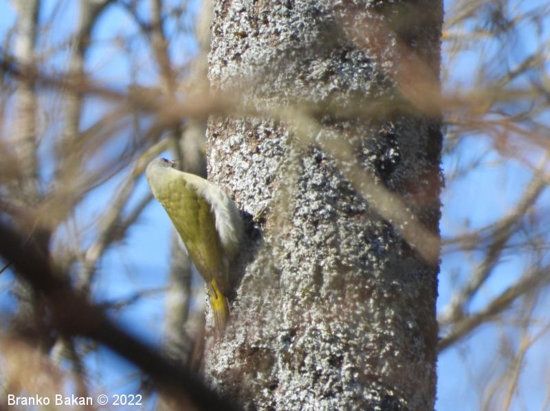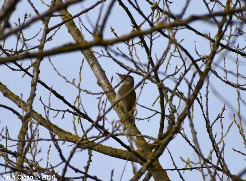Oglašanje: zelo podobno zeleni žolni, vendar bolj oddaljeno in manj "smejoče", proti koncu pojemajoče in nenadoma prekinjeno "kjü-kjü-kjü-kjü küü küü küü kü..".