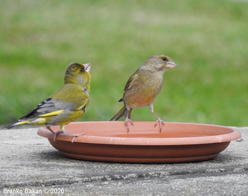 Samica: bolj rjavkasta od samca z mnogo manj rumene in zelene obarvanosti perja, po hrbtu in trebuhu tudi rahlo progasta. V repu manjša rumena lisa kot pri samcu.