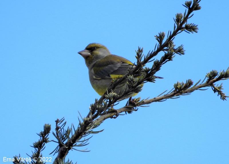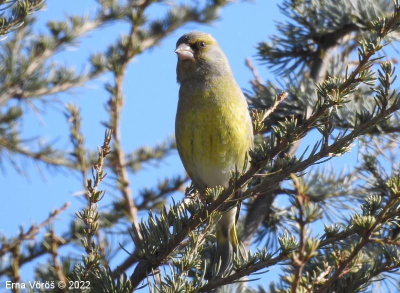 Samec: telo dokaj čokato, z močno glavo in dokaj kratkim repom. Perje po zgornji strani glave in po hrbtu olivno- do sivozeleno. Lica so sivkasta. Pri očeh nekoliko temnejši. Prsi in trebuh rumenozelena. Kljun močan, širok a kratek, koničast, svetel. Krila so sivkasta, s poudarjeno rumenimi primarnimi peresi. Trtica rumenozelena. Rep sivkast z rumeno lisasto obrobo.