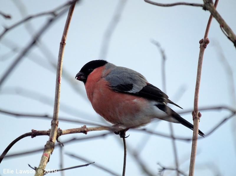 Samec: zgornji del glave nad očmi bleščeče črn. Zatilje, hrbet in ramenski del peruti sivi. Po licih, prsih in trebuhu enotno karminasto rdeč. Kljun kratek, precej širok in močan, koničast, temen. Trtica in podrepni del bela. Krila skoraj črna z belim pasom čez sekundarna peresa. Rep sorazmerno dolg, črn.