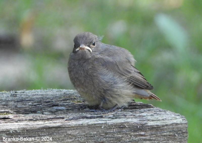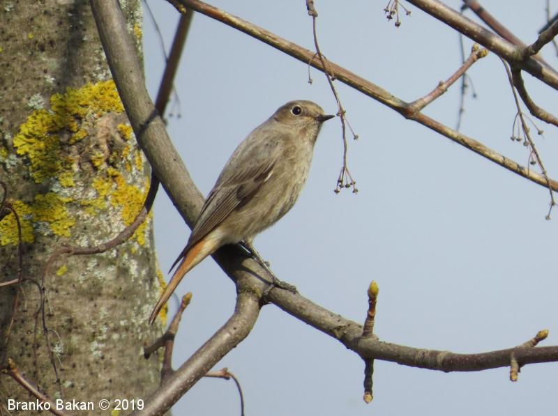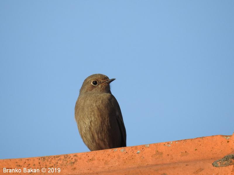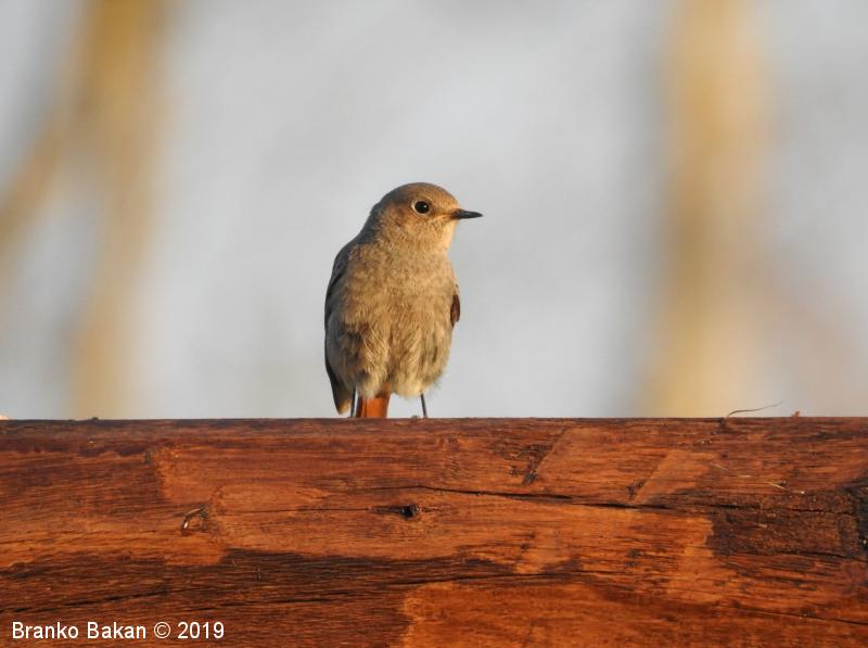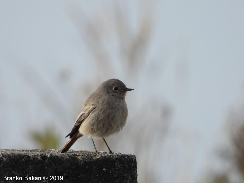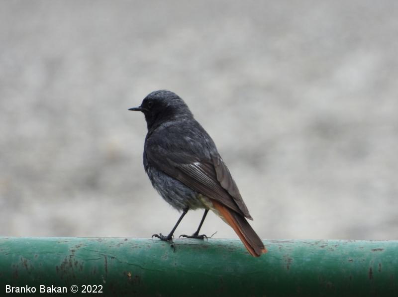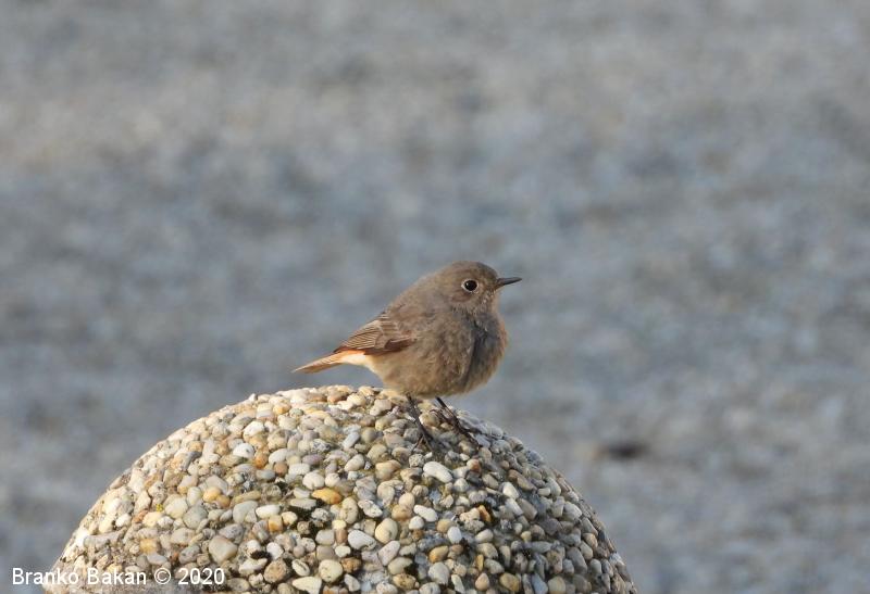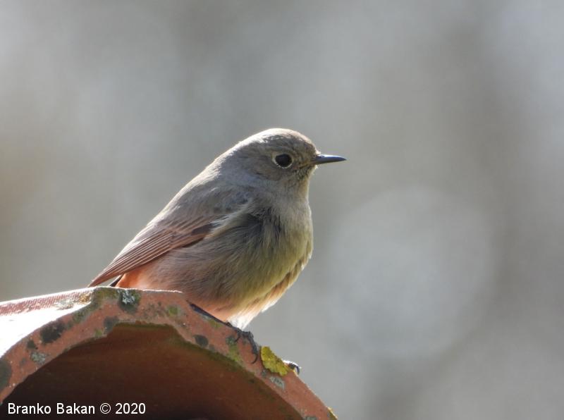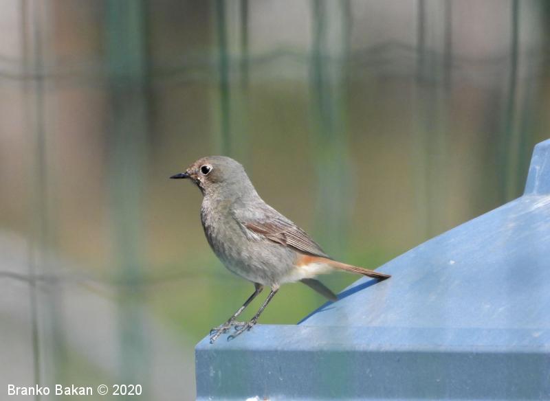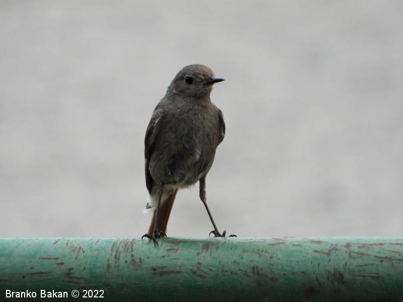 Samica: skoraj v celoti sivorjava, le rep in podrepni del sta rjasto rjava.