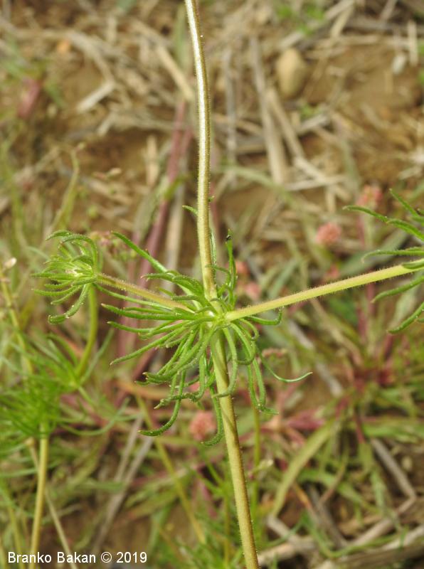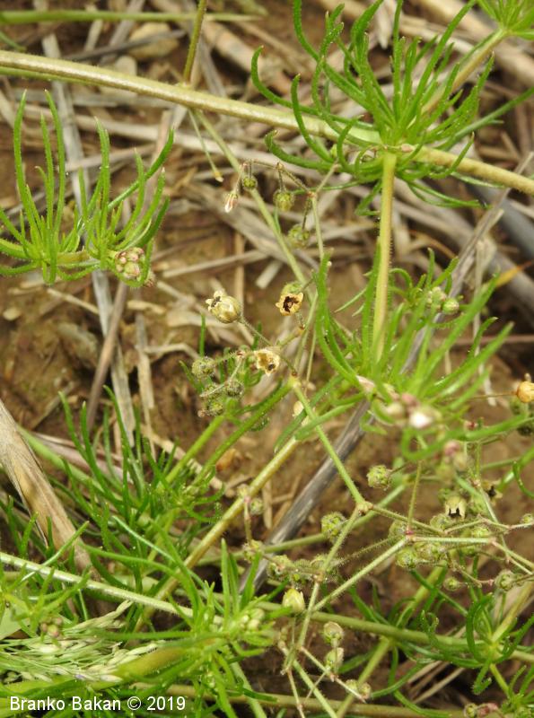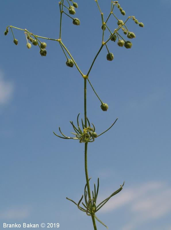 Opis: pokončna ali kipeča enoletnica. Steblo pri dnu rozetasto razraslo, raztreseno žlezasto dlakavo, v prerezu okroglo. Listi ozko črtalasti, šopasto izraščajo v navideznih vretencih, goli ali raztreseno žlezasto dlakavi, nekoliko mesnati, na bazi s parom drobnih, suhokožnatih prilistov. Cvetovi na dolgih pecljih, ki se kasneje zasukajo navzdol, združeni v malocvetna, pakobulasta socvetja, 5-števni, 4-7 mm veliki. Venčni listi le malo daljši od čašnih listov, ki so gosto žlezasto dlakavi, na vrhu koničasti in imajo ozek, suhokožnat rob. Prašnikov 10, vratov na pestiču navadno 5. Plod je glavica, ki se odpira s 5 zobci. Semena so bočno sploščena, z zelo ozkokrilatim robom ali brez njega.