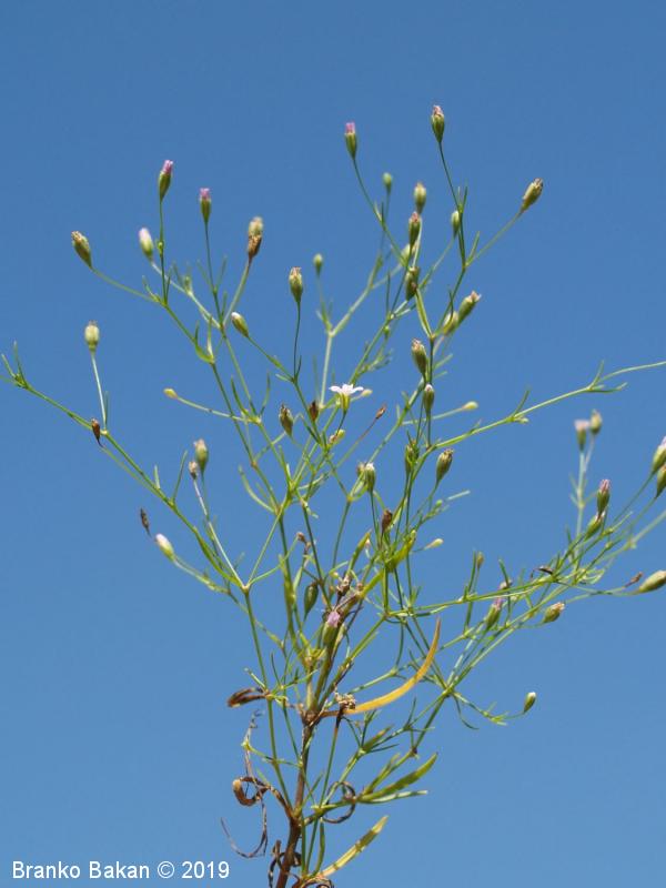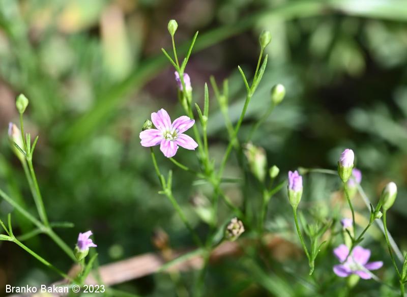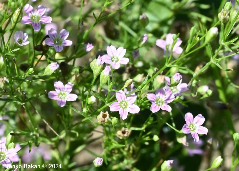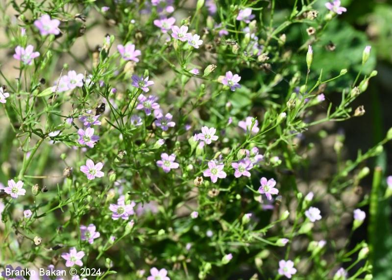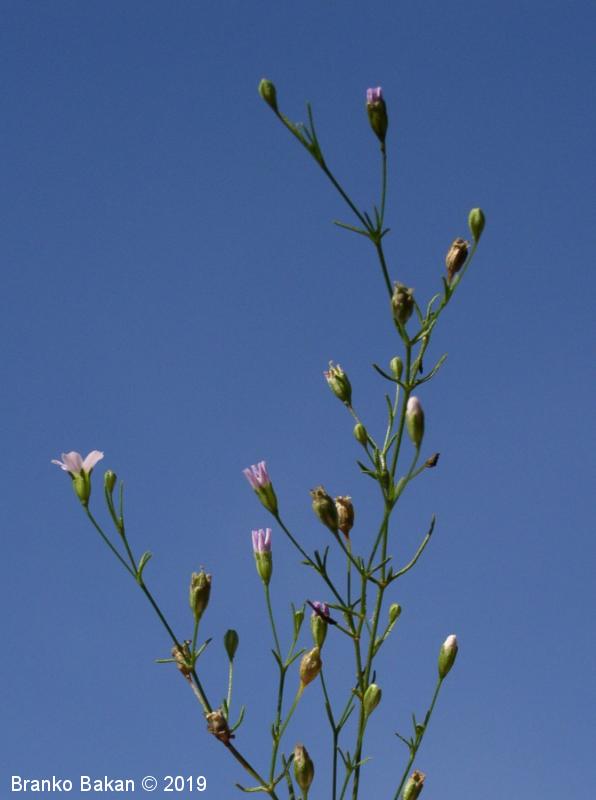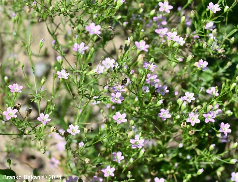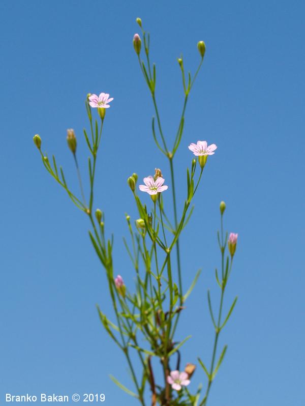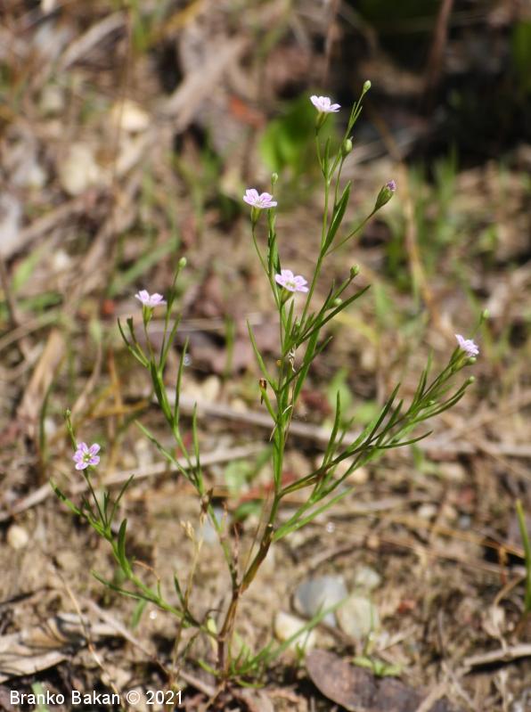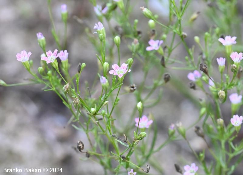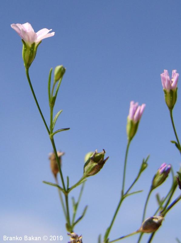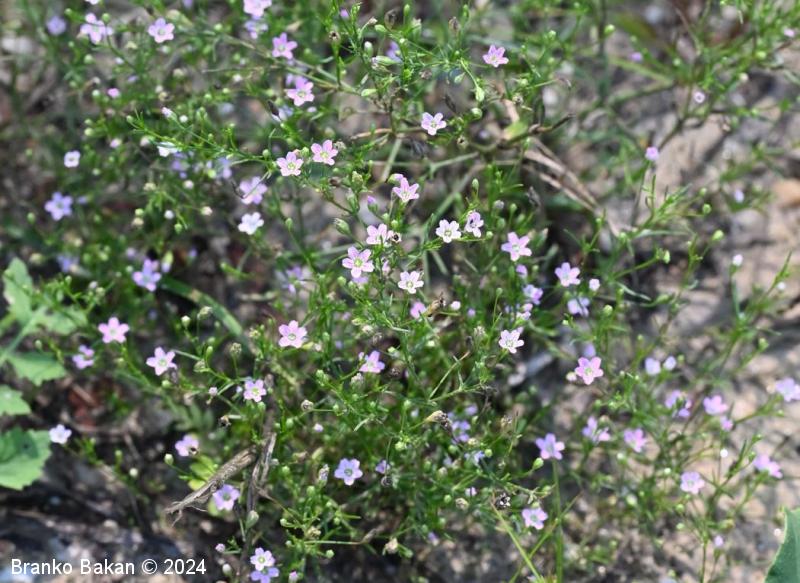 Opis: dokaj nežna, močno razrasla, polegla, kipeča ali pokončna enoletnica. Steblo je zelo tanko, golo, razvejano, sivozeleno. Listi so ozko črtalasti, nasprotno razvrščeni, sedeči, goli, pri vrhu koničasto priostreni. Cvetovi so drobni, 2 do 4 mm veliki, v rahlih, pakobulastih socvetjih, 5-števni, rožnati, s temno škrlatnimi žilami. Venčni listi imajo plitvo izrobljeno ploščico in do 2 mm dolgo, neizrazito žebico. Čašni listi imajo širok, suhokožnat rob, med seboj so zrasli v čašno cev. Prašnikov je 10, pestič ima 2 vratova. Plod je glavica.