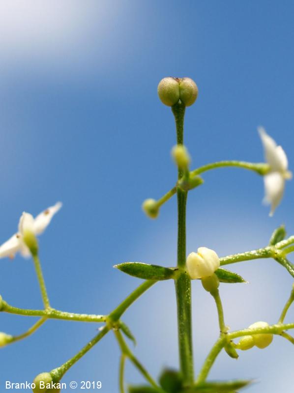 Opis: zelnata trajnica, z izrazito 4-robim, golim in gladkim, v spodnjem delu plazečim steblom, ki se mestoma ukoreninja. Listi so ozko suličasti, enožilnati, na vrhu kratko ostnato priostreni, celorobi, gladki, temnozeleni, nekoliko bleščeči. Cvetovi so drobni, 2-3 mm veliki, pecljati (peclji navadno daljši od premera cvetov), 4-števni, združeni v gostocvetna, latasto razrasla, obstranska in ovršna socvetja, prijetno dehteči. Venčni listi proti vrhu podaljšani v zelo kratko, neostnato konico. Plod je okroglast, gol, razpade na dva plodiča.