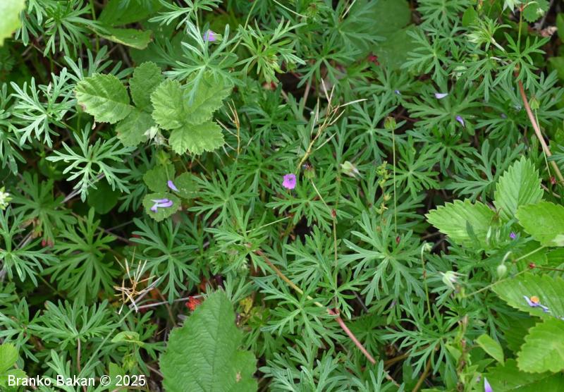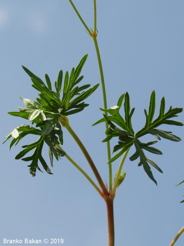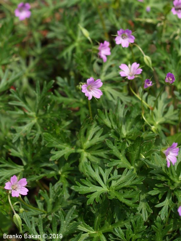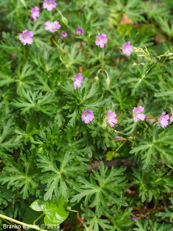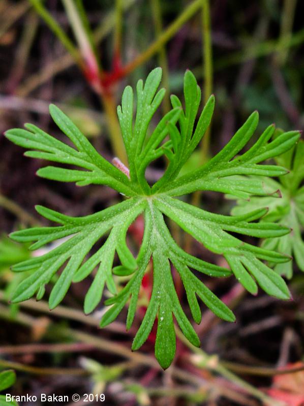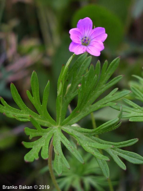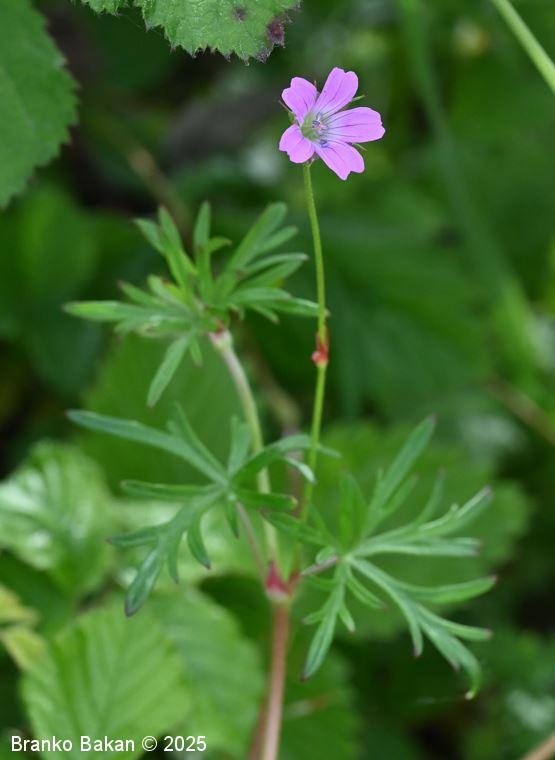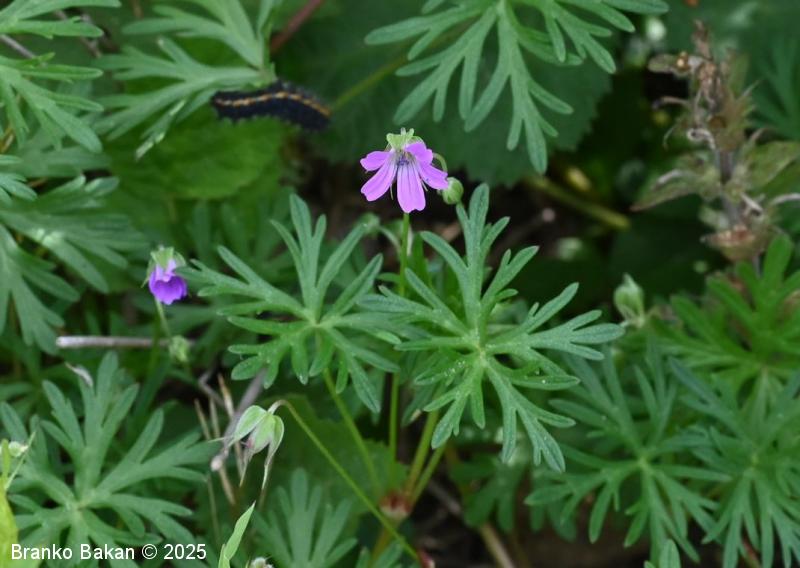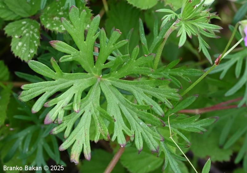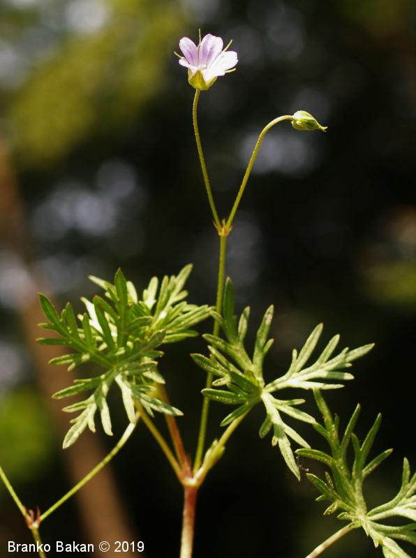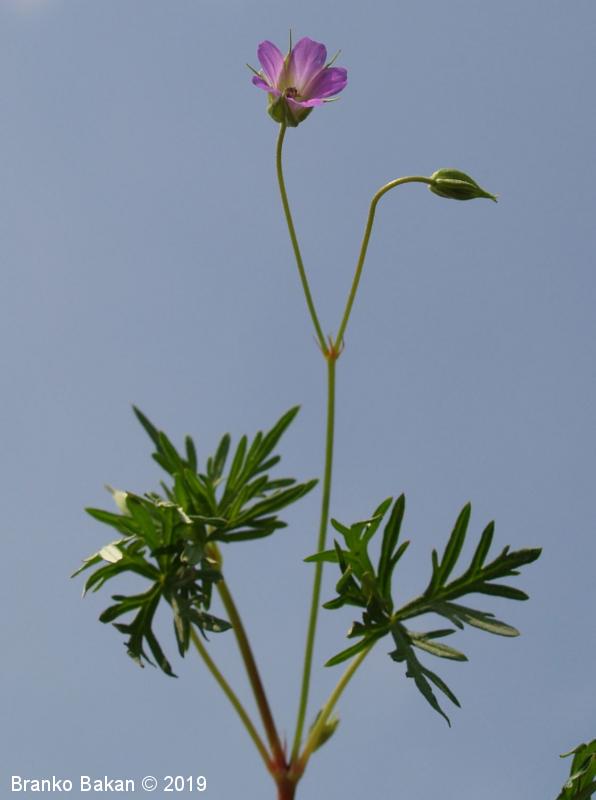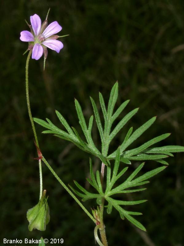 Opis: rozetasto razrasla do pokončna enoletnica. Steblo okroglo, prileglo dlakavo (dlake enostavne, nežlezaste), večinoma rdečkasto nadahnjeno. Listi dolgopecljati, nasprotno razvrščeni, do dna deljeni in nacepljeni v ozke, črtalaste segmente oz. roglje. Cvetovi po 2 skupaj na dolgih pecljih, 5-števni. Venčni listi 7-10 mm veliki, na vrhu zaokroženi, pri dnu kratkodlakavi, klinasto zoženi. Čašni listi jajčasti, na vrhu ostro priostreni. Prašnice so vijoličaste. Plod razpade na 5 plodičev, ki so na vrhu podaljšani v dolg kljunec.