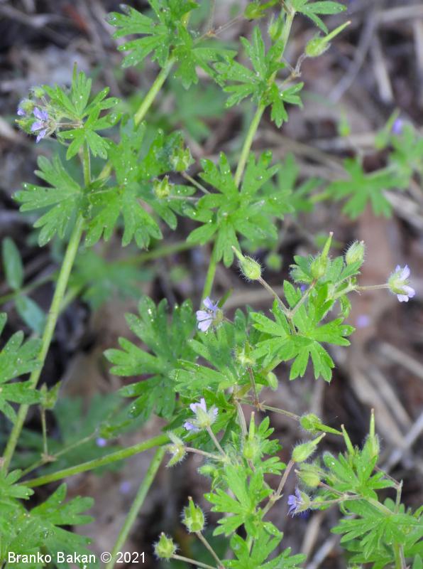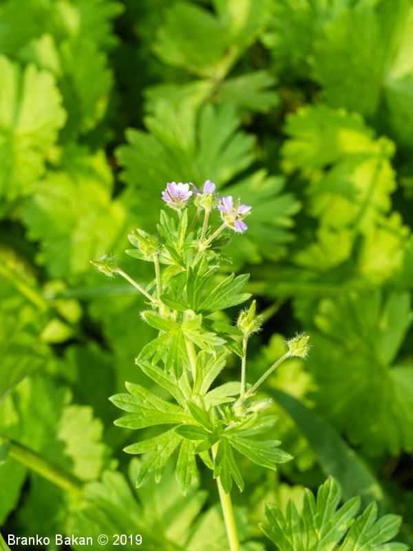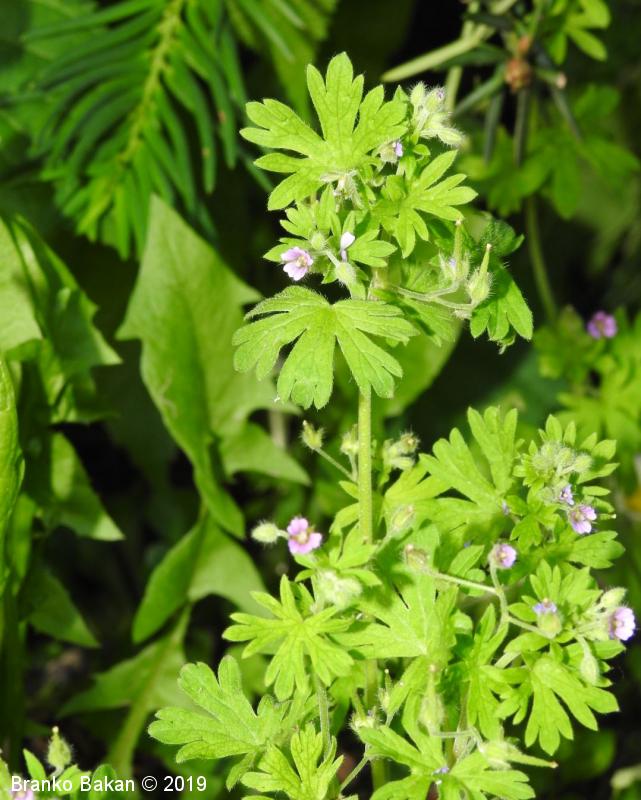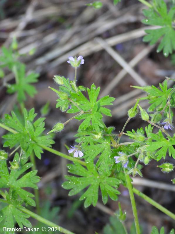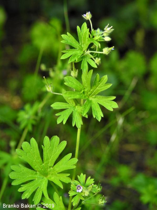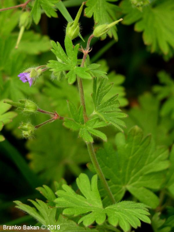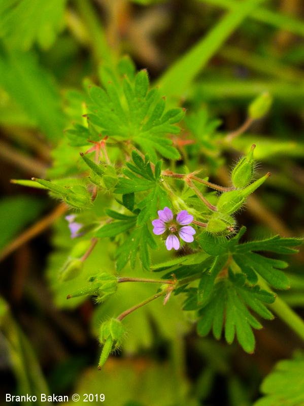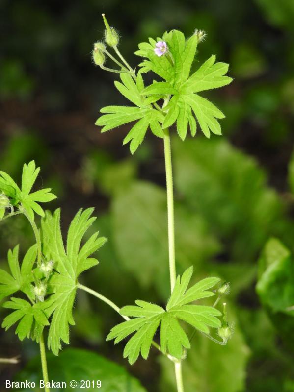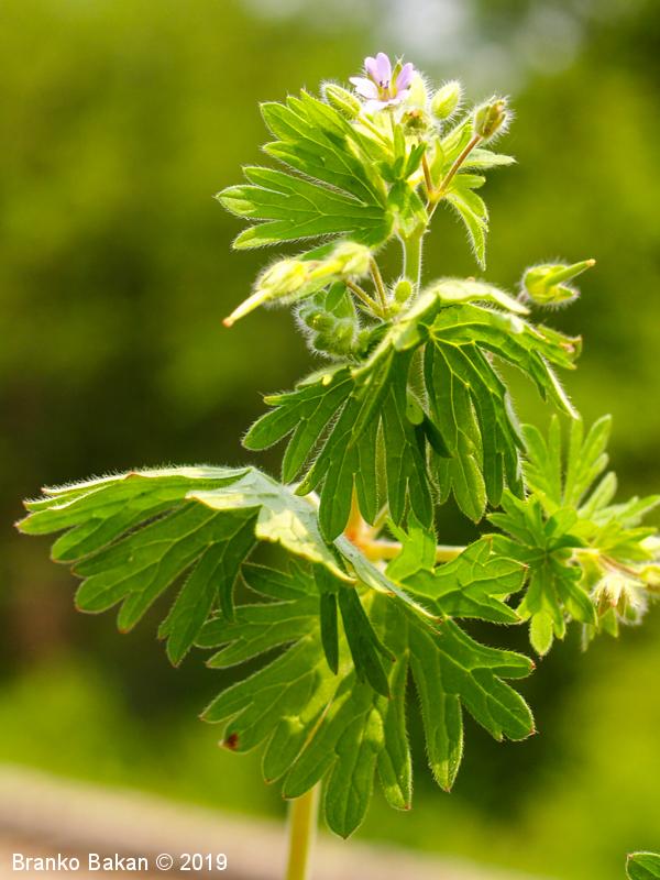 Opis: pokončna ali rozetasto razrasla enoletnica. Steblo okroglo, kratkodlakavo (dlake tako enostavne, kot tudi žlezaste), pogosto rdečkasto. Listi dolgopecljati (na bazi peclja dva majhna, suličasta prilista), nasprotno razvrščeni, deljeni do 3/4 (v obrisu pahljačasti ali okrogli), nacepljeni v široke segmente oz. roglje, mehkodlakavi. Cvetovi po 2 skupaj na dolgih pecljih (peclji navadno ukrivljeni, kratko žlezastodlakavi), 5-števni. Venčni listi 3-4 mm veliki, na vrhu plitvo izrobljeni, pri dnu klinasto zoženi. Čašni listi jajčasti, na vrhu priostreni, dlakavi. Prašnice so vijoličaste. Plod razpade na 5, kratkodlakavih plodičev, ki so na vrhu podaljšani v dolg kljunec.