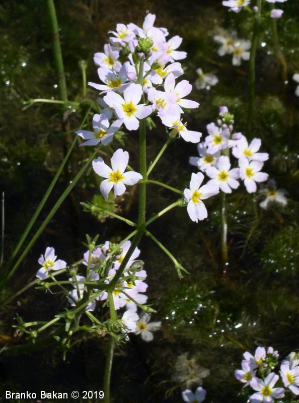 Opis: steblo in listi potopljeni (pri vodnih primerkih), cvetoče steblo se razvije nad vodno gladino. Listi 1-krat pernato sestavljeni, deljeni v ozkočrtalaste roglje, spodnji listi premenjalno razvrščeni, zgornji listi razvrščeni v vretencih (pri kopenskih rastlinah le v vretencih). Cvetovi združeni v nerazraslo, navidezno grozdasto socvetje, sicer v krogih nameščeni po steblu, dolgopecljati, z rumenim goltom, sicer snežno beli, redkeje rožnati, nad polovico zrasli v venčno cev. Čašni listi črtalasti, v spodnjem delu med seboj zrasli. Plod je glavica.