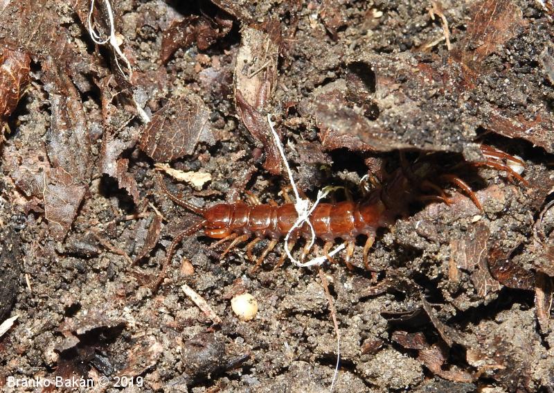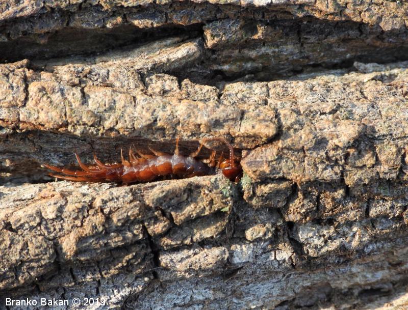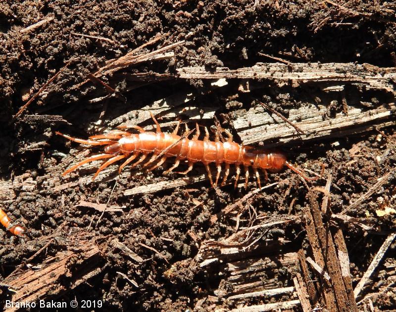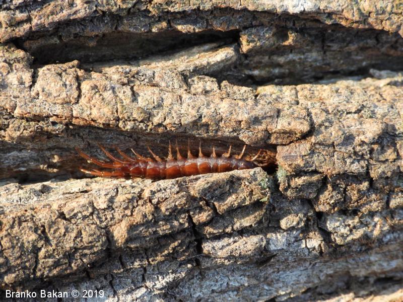 Odrasli osebki: telo je hrbtno-trebušno sploščeno, rdeče- do rumenorjavo, bleščeče, gladko, členasto, na vsakem členu s po enim parom nog. Prednje noge so preobražene v lovilni organ in spominjajo na "čeljusti", vsebujejo tudi strupne žleze. Glava dokaj velika, z dolgimi, drobno členastimi tiaplnicami. Zadnje noge precej daljše od sprednjih nog in služijo predvsem za tipanje. Oči so drobne. Zadnji segment nima nog in vsebuje spolne organe.