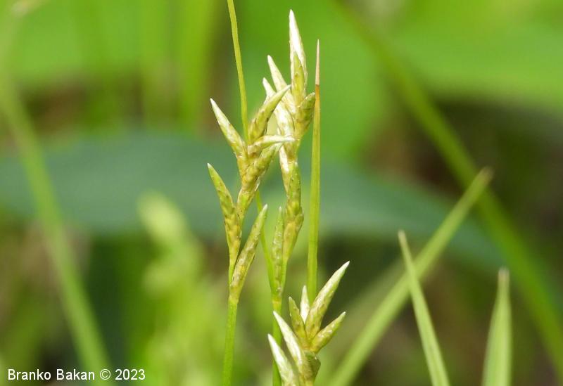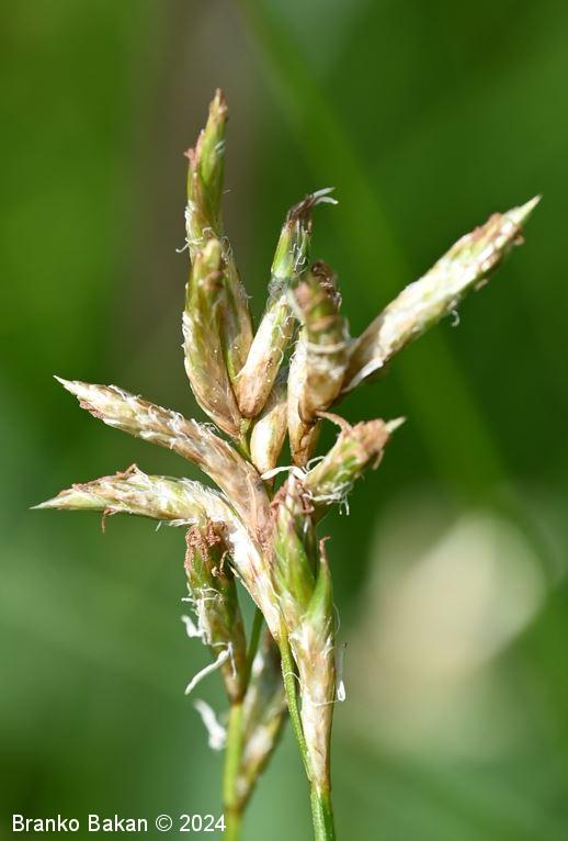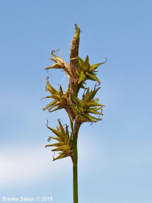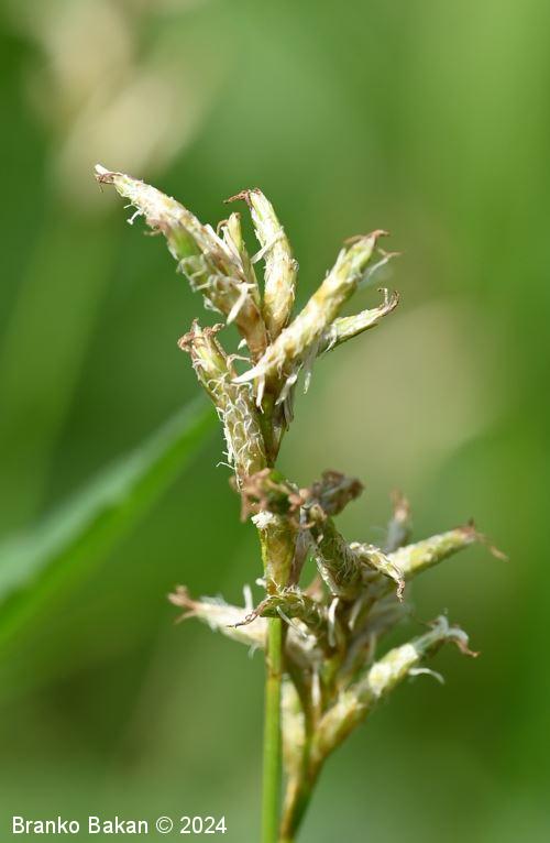 Opis: rušnato razrasla trajnica z dolgimi, podzemnimi pritlikami. Steblo ostro do topo trirobo, olistano v spodnji polovici, po robovih srhko, pogosto mlahavo in previsno. Listi 2-3 mm široki, ploski, mlahavi, po robovih srhki. Klaski zgoščeni v ovršno, malocvetno socvetje, belkasti, sedeči, ob zrelosti se nekoliko ukrivijo, moški cvetovi na dnu klaskov, hitro propadejo. Spodnji podporni list socvetja ščetinast, redkeje zelnat, mnogo krajši od klaska, štrleč. Zreli mošnjički jajčasti, naglo zoženi v zelo kratek, preklan kljunec, po robu srhki in ozkokrilati. Krovne pleve ženskih cvetov belkaste do slamnato rumene, jajčaste.