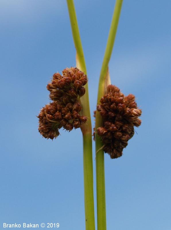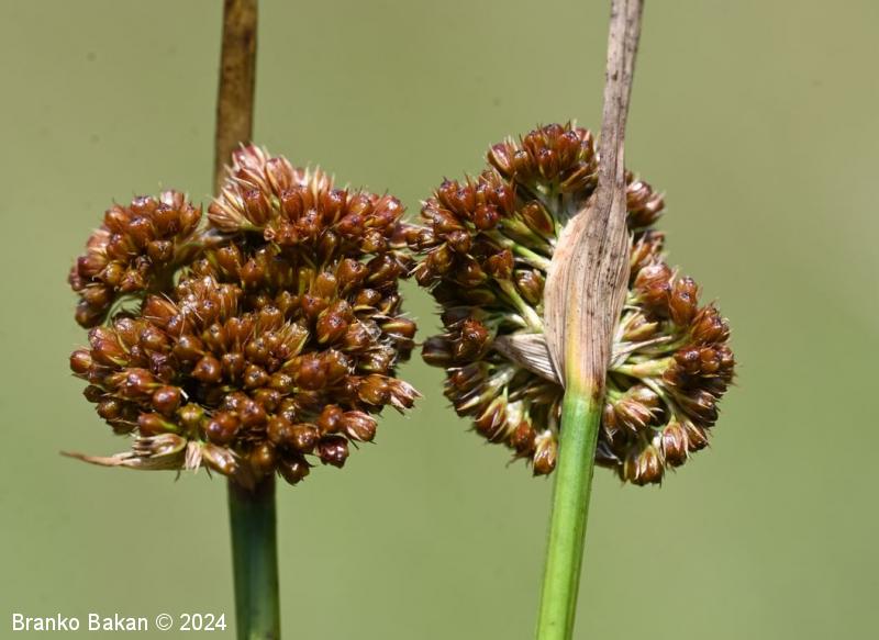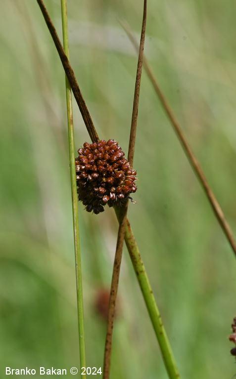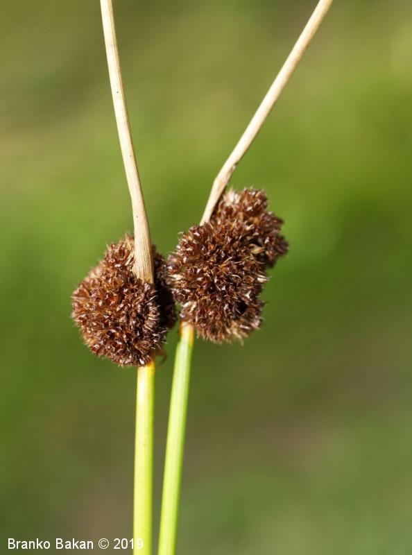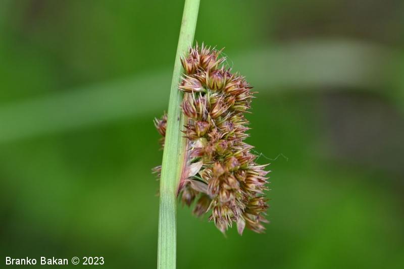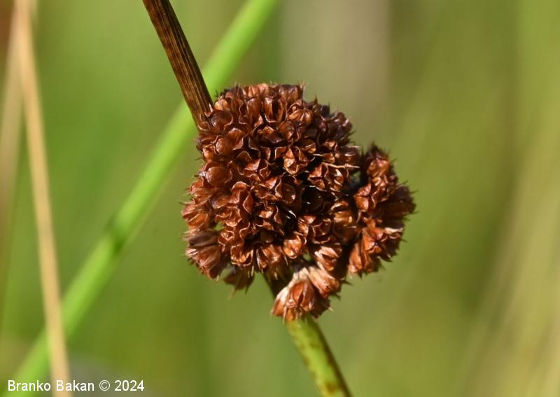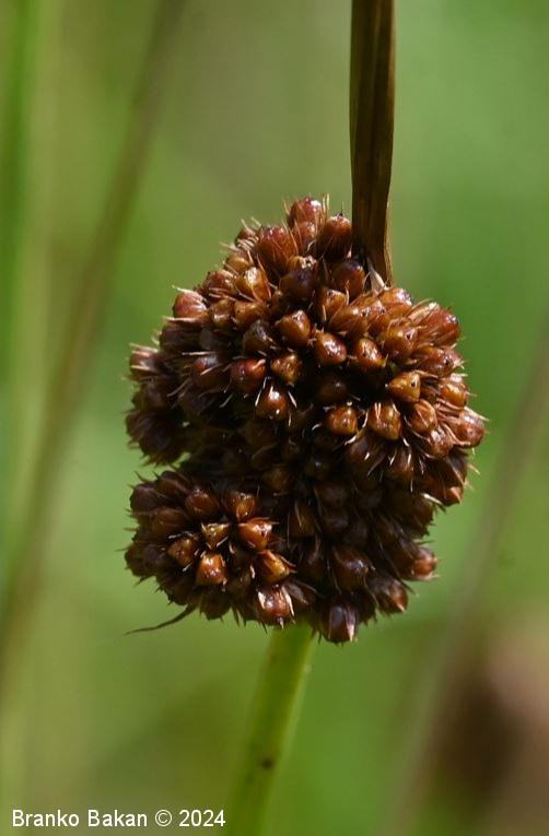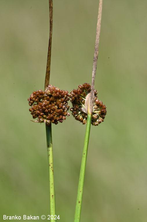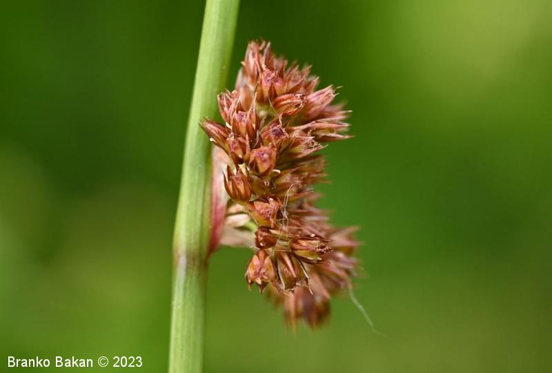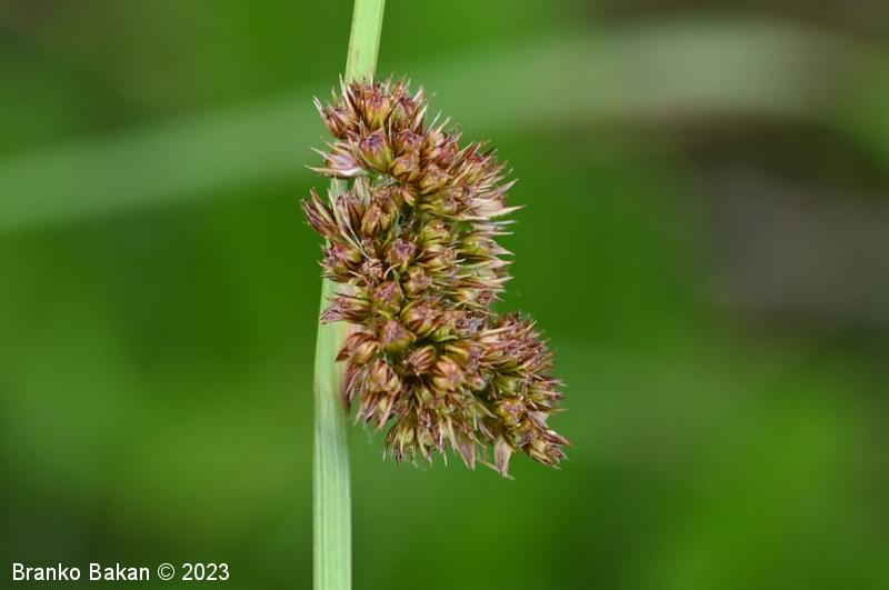 Opis: šopasto do rušnato razrasla trajnica. Steblo neolistano, v prerezu okroglo, rahlo plitvo izbrazdano, zapolnjeno z mehkim gobastim zračnim tkivom (aerenhim), pri dnu z rdečerjavimi listnimi nožnicami, sivozeleno. Socvetje šopasto, mnogocvetno, navidez obstransko, sedeče, nadrašča ga enostaven, koničast list, ki je videti kot podaljšek stebla. Cvetovi drobni, rdeče- do temnorjavi, zvezdasto razprostrti, 5-števni, perigonovi listi šilasti, vsi enako dolgi, daljši od plodu. Plod jejajčasta glavica, na vrhu koničast.